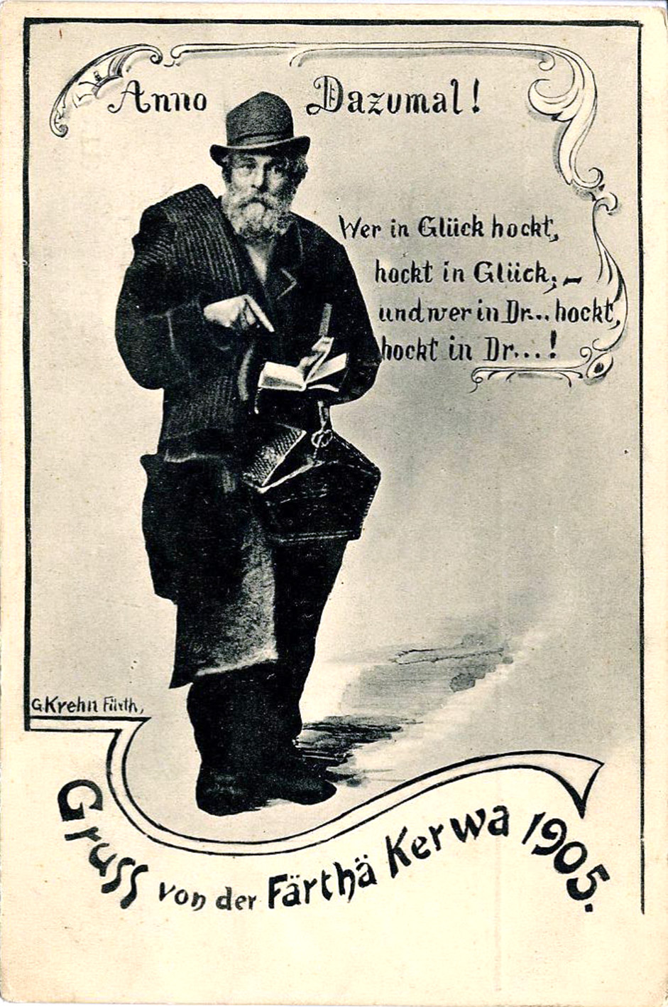 | Beschreibung | Gruß von der Fürther Kirchweih, historische Ansichtskarte, 1905. Motiv „Fürther Original“ Bernhard Gnad oder auch der "Gnadnsiea" | ||