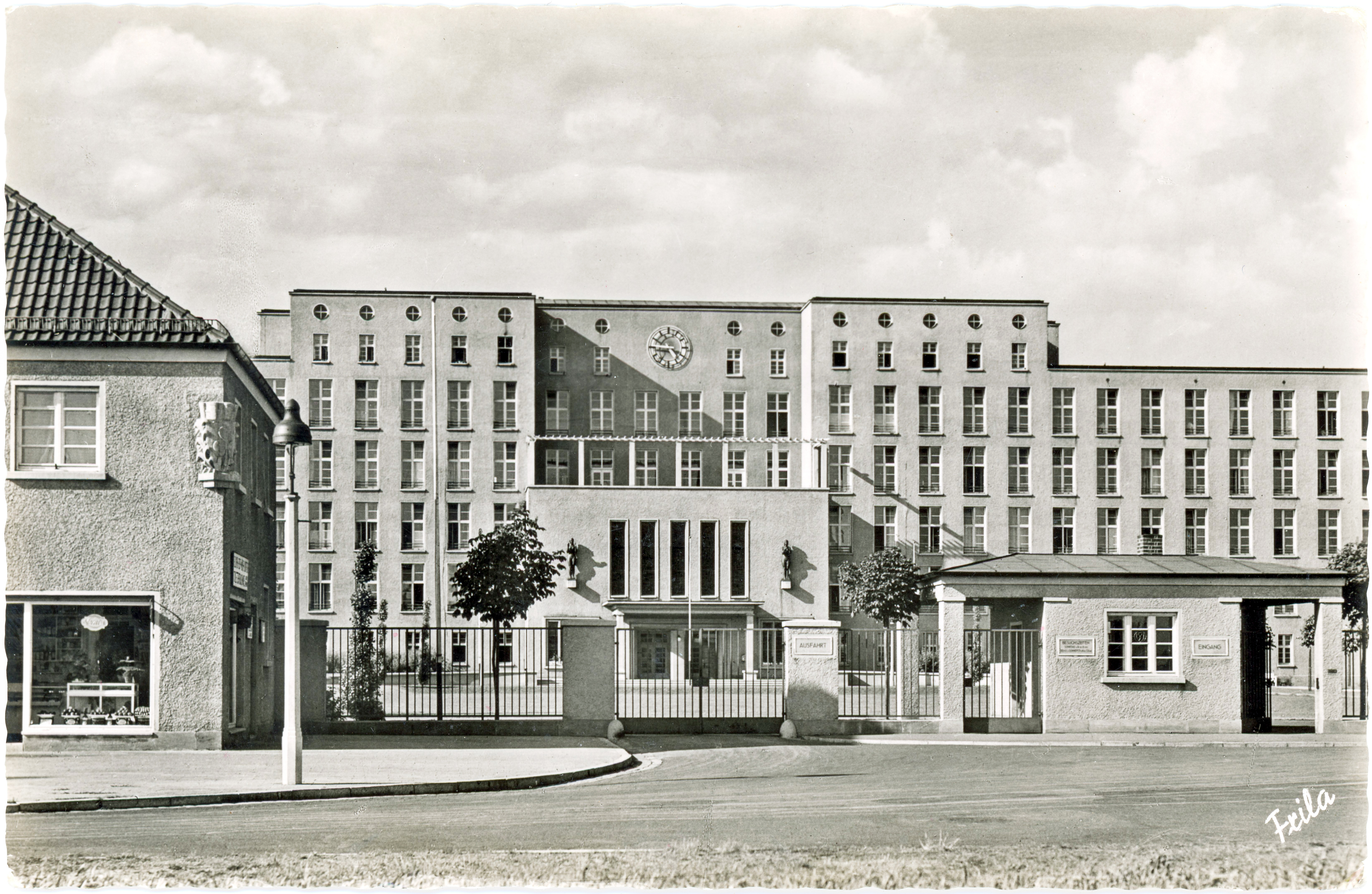 | Beschreibung | Stadtkrankenhaus, Einfahrt, links im Bild der Kiosk vom ehem. Betreiber Georg Reinmann, ca. 1950 | ||