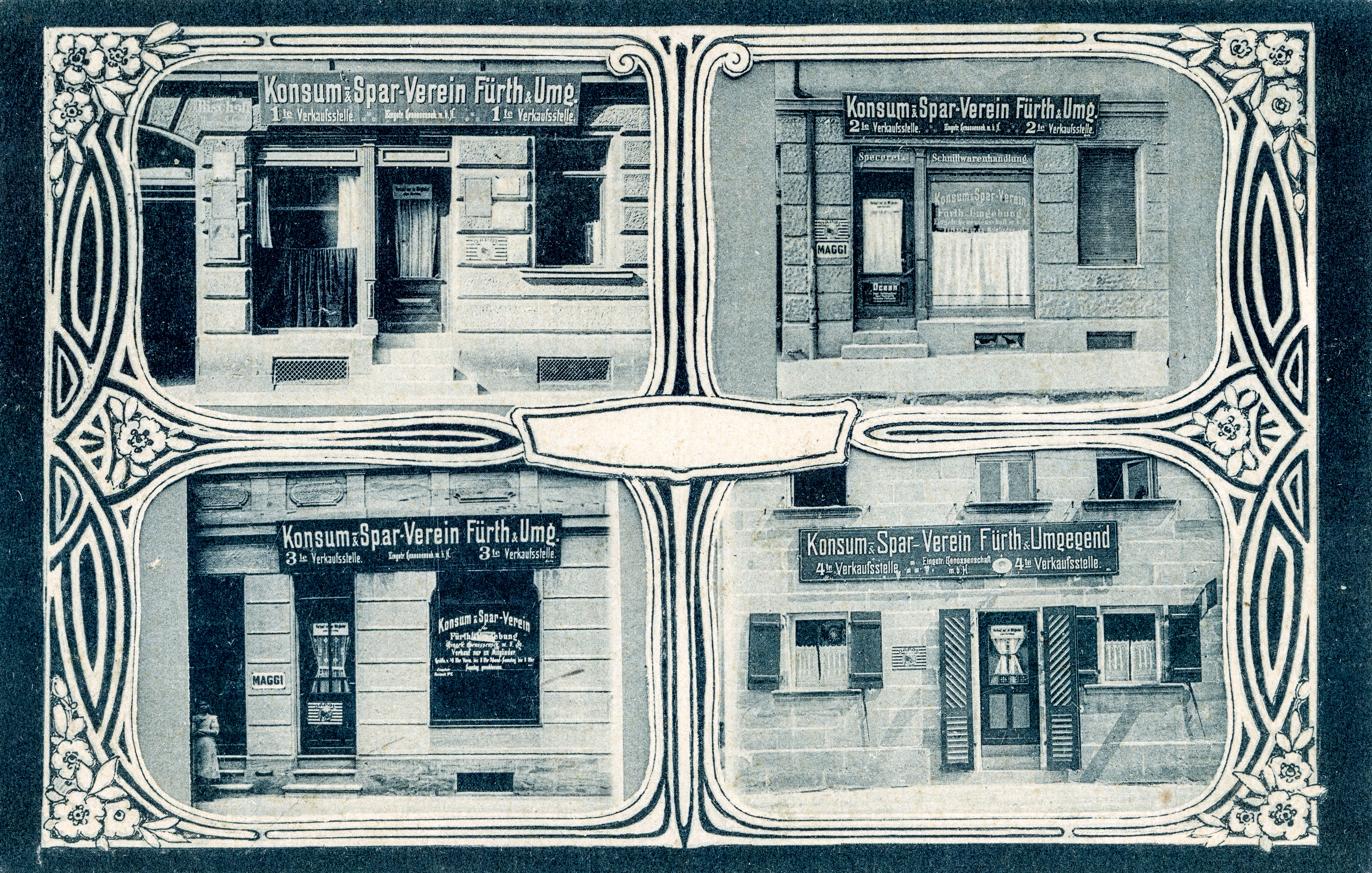 | Beschreibung | Ansichtskarte mit Filialen des Konsum-Spar-Verein Fürth und Umgebung, gel. 1908 | ||