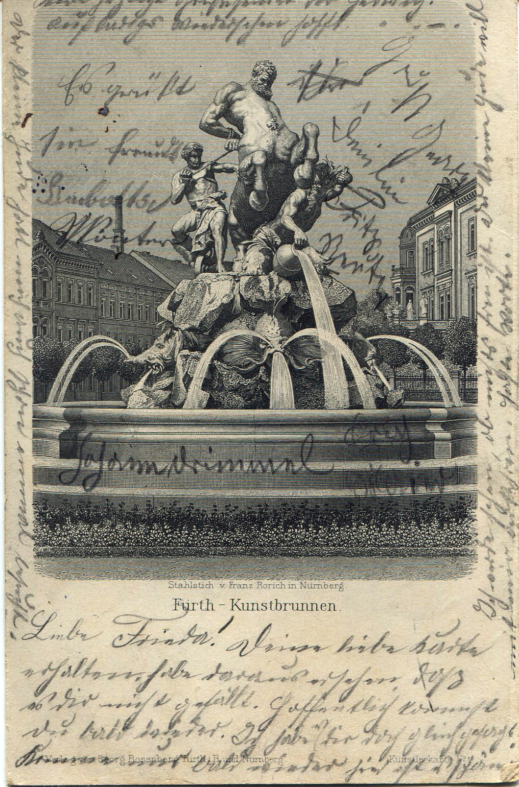 | Beschreibung | Alte Ansichtskarte vom Centaurenbrunnen, Stahlstich von Franz Rorich, gel. 1904 | ||