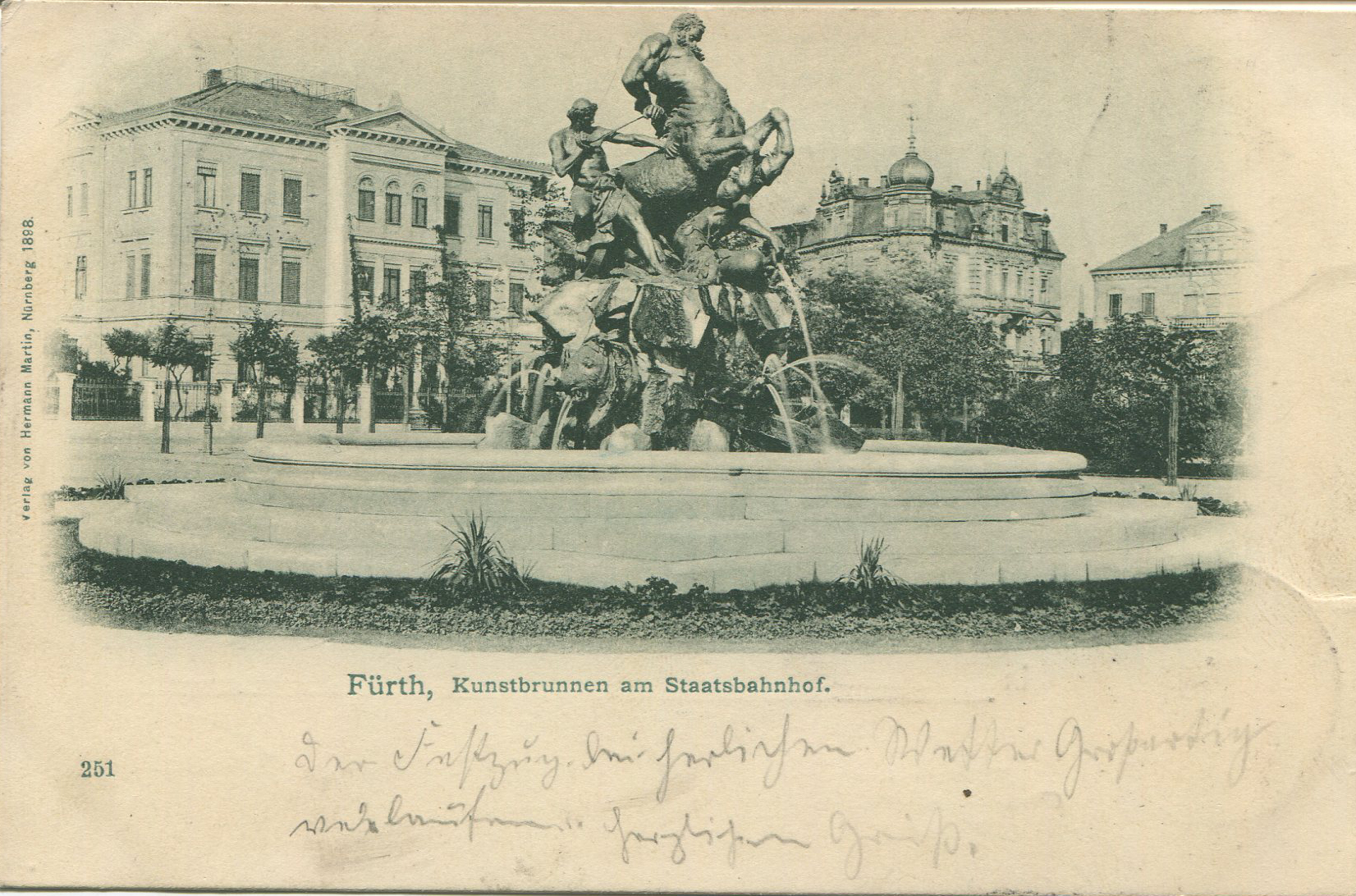 | Beschreibung | Ansichtskarte von Bahnhofplatz mit Kunstbrunnen - im Hintergrund die ehem. Sahlmannvilla und die Villa des Isaak Stamm, gel. 1908 | ||