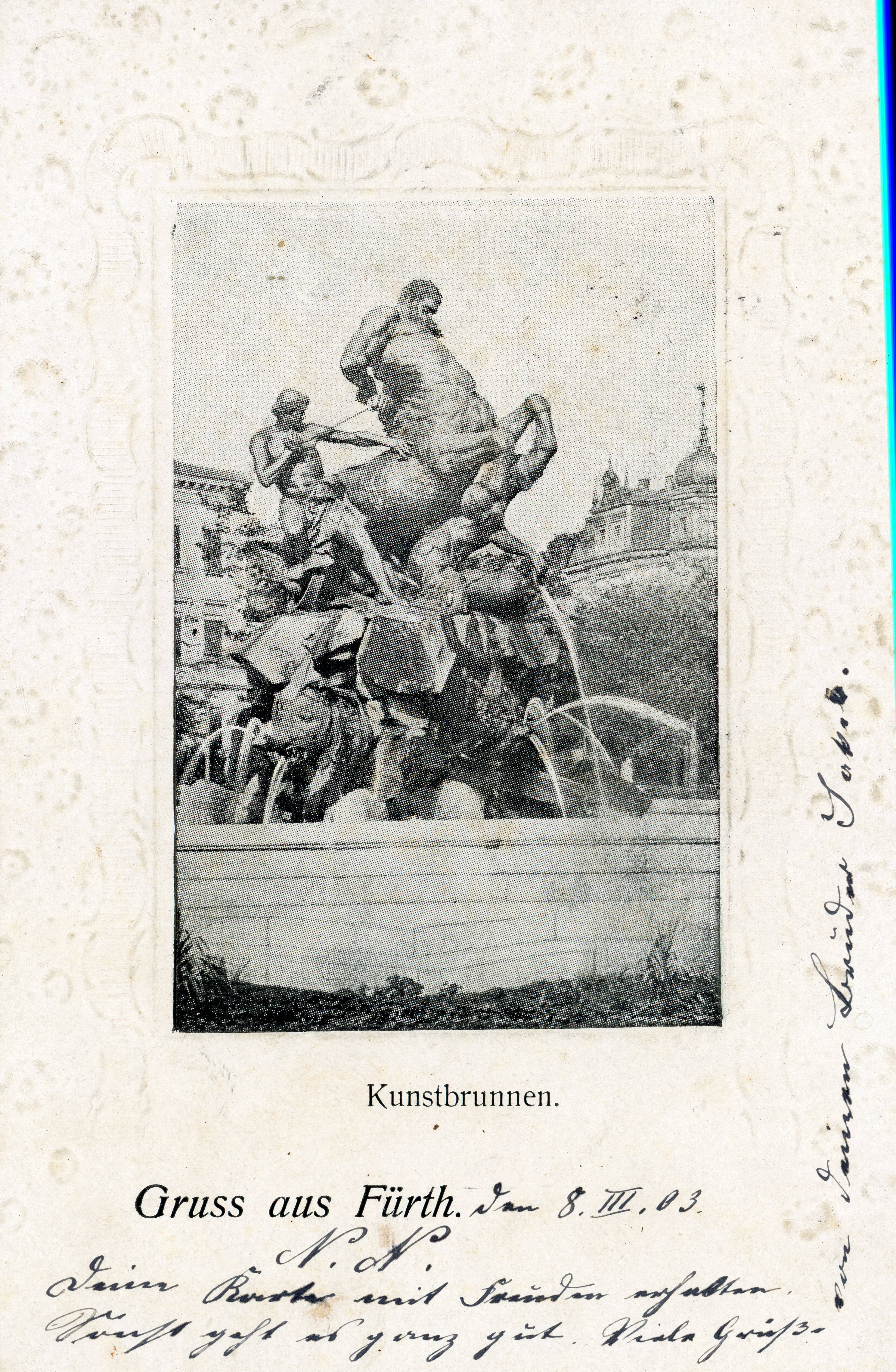| Beschreibung | Ansichtskarte mit Kunstbrunnen, gel. Mrz 1903 | ||