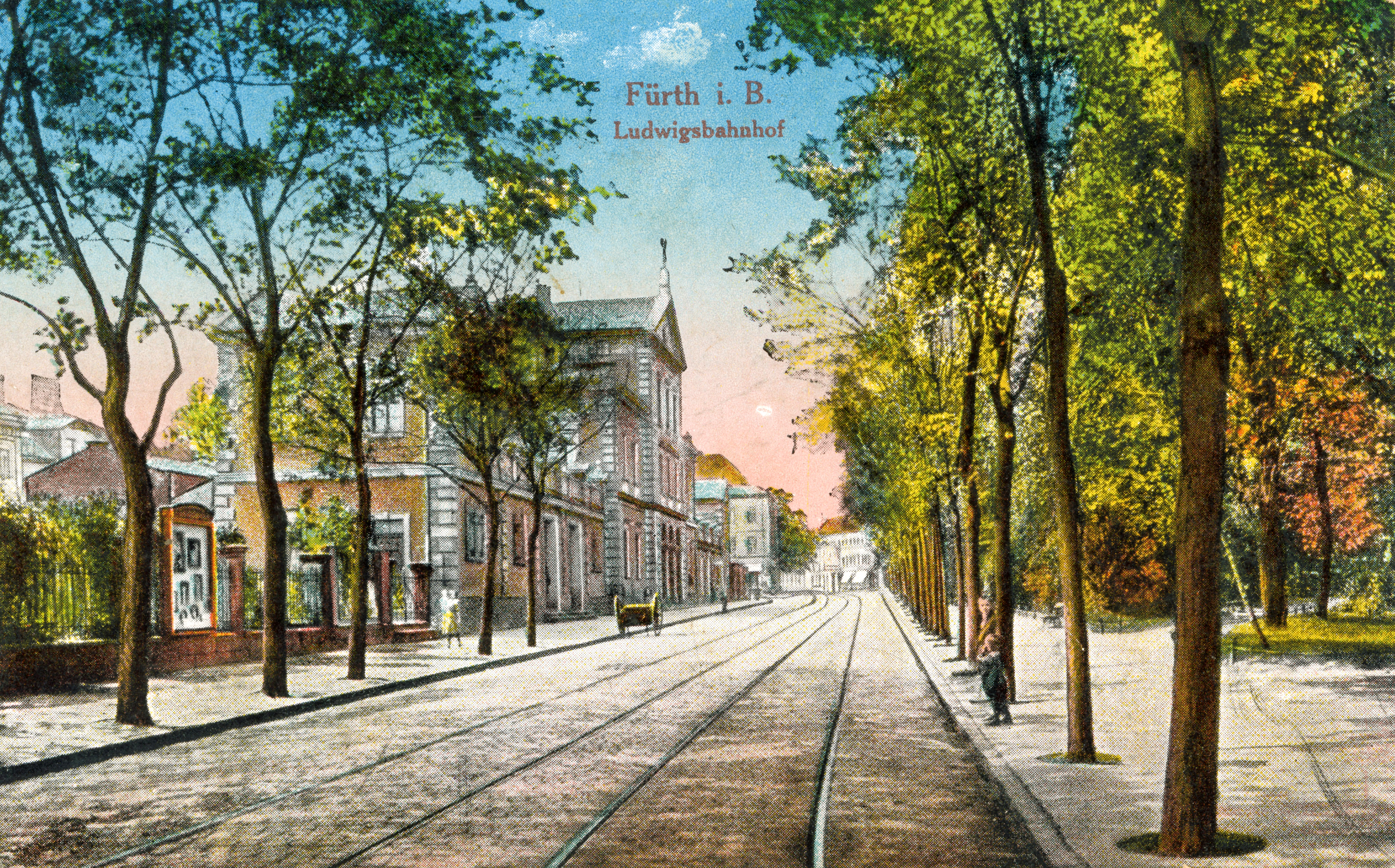 | Beschreibung | Blick in die heutige Rudolf-Breitscheid-Straße mit Straßenbahnschienen, links der ehem. Ludwigsbahnhof, gel. Feb 1918 | ||