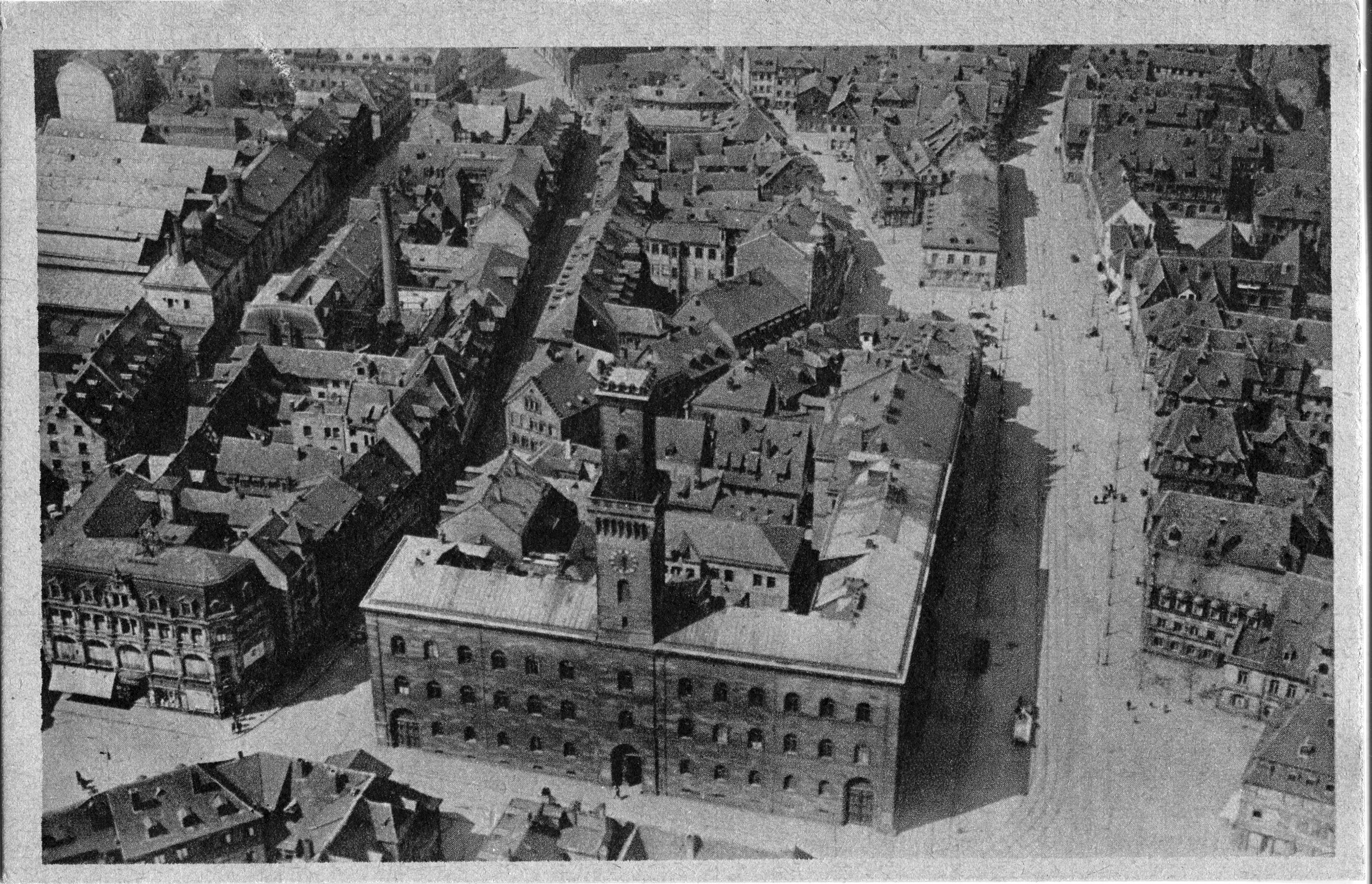 | Beschreibung | Alte Luftbildaufnahme von der Innenstadt, in der Bildmitte das Rathaus, im Hintergrund die Brauerei Grüner | ||