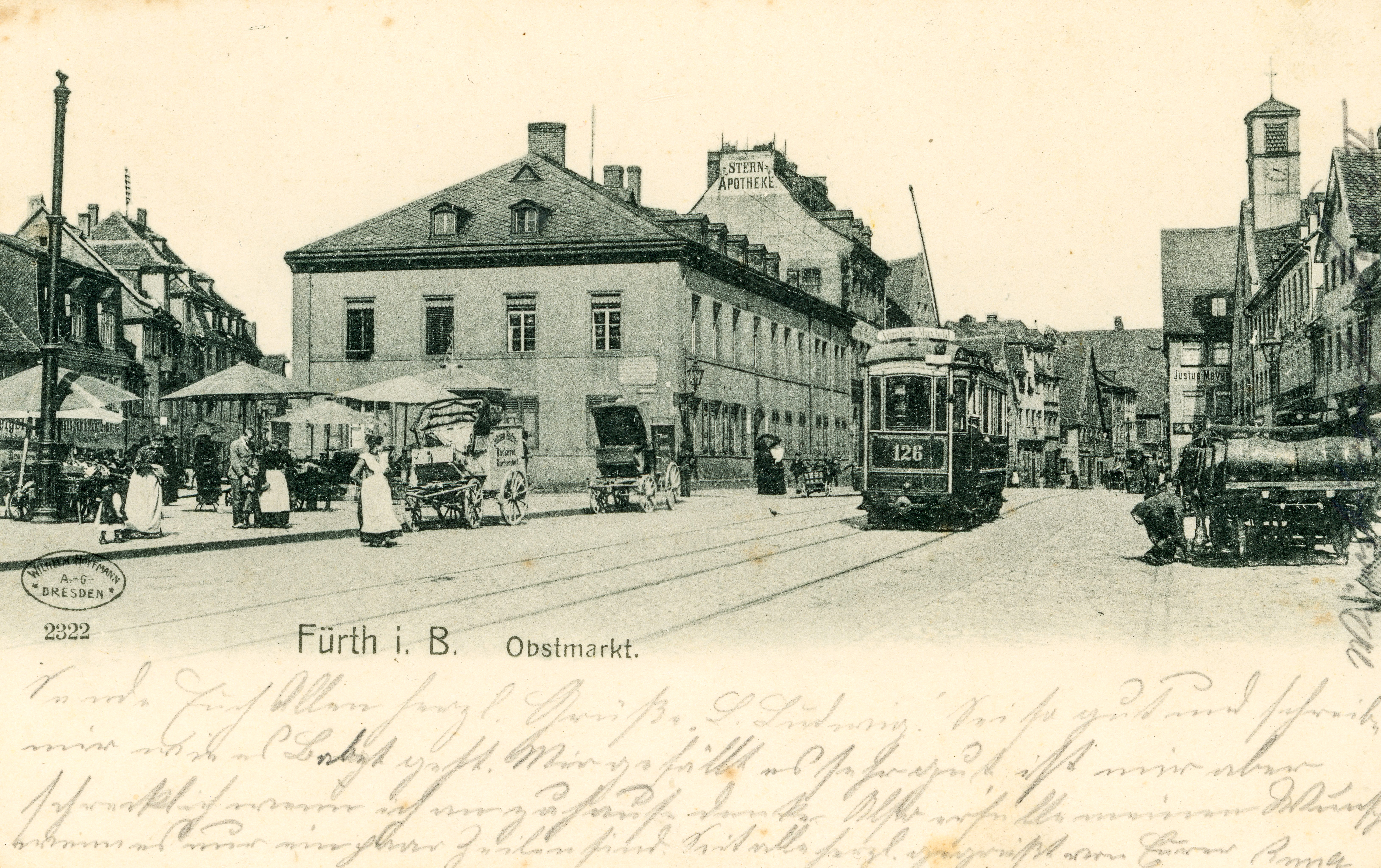| Beschreibung | Blick über den Obstmarkt mit bunten Wochenmarkttreiben und Straßenbahn, ca. 1905 | ||