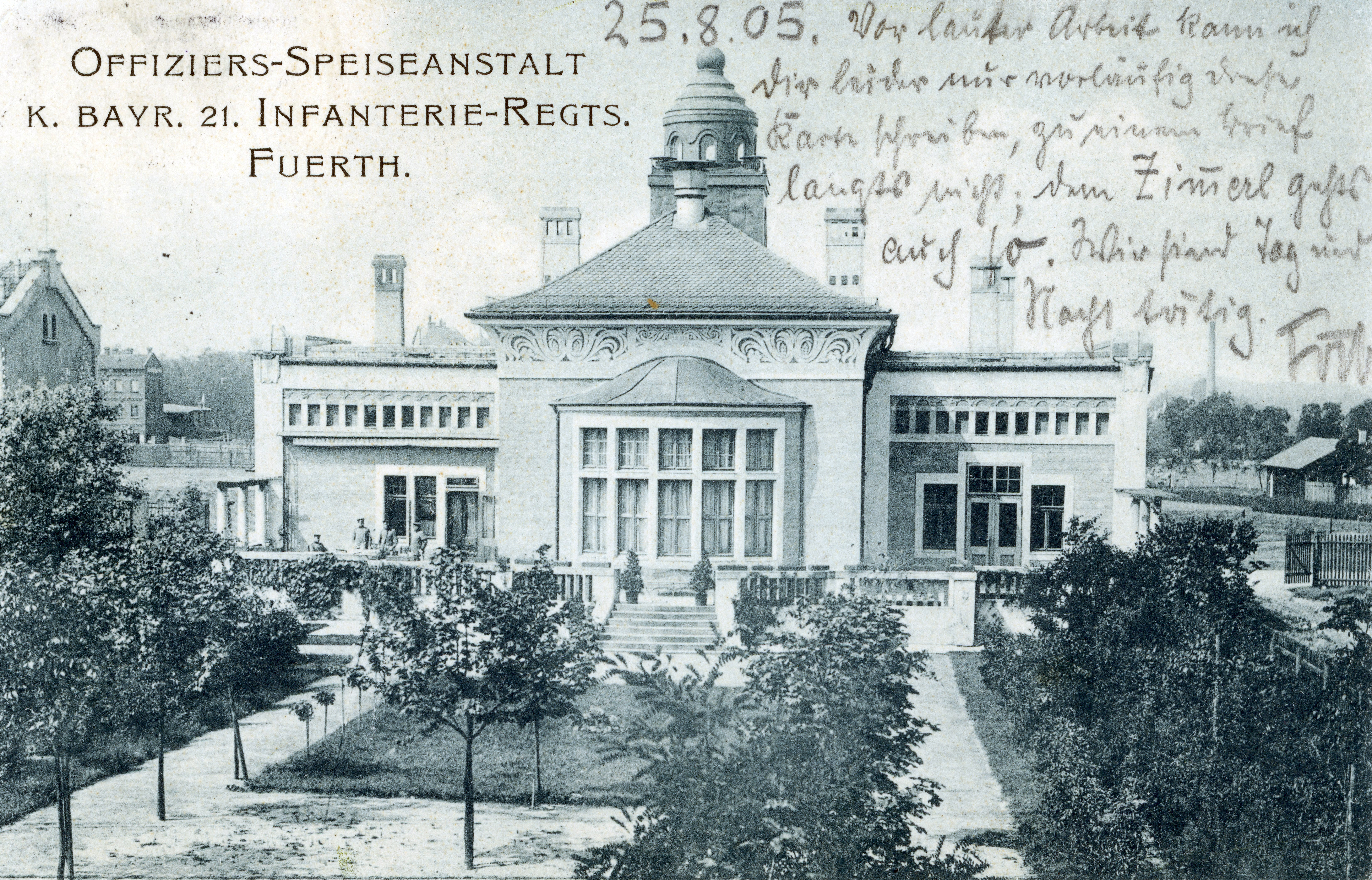 | Beschreibung | Offizierskasino (Offiziers-Speiseanstalt) des Kgl. bayer. 21. Inf-Regts., Steubenstr. 27, gel Aug 1905 | ||