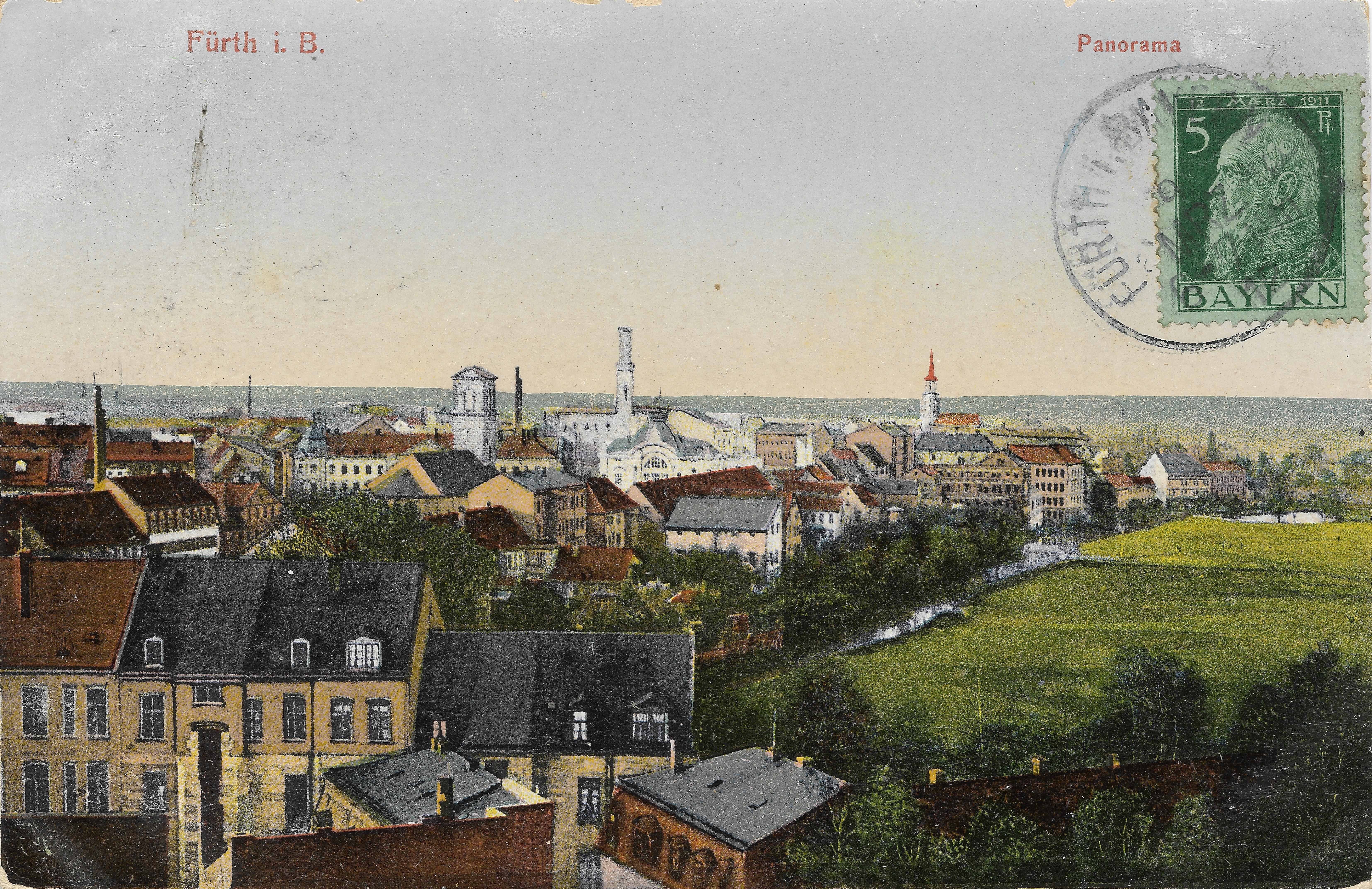 | Dateiinfo (Bild-Unterschrift und Info-Box, automatisch erstellt) | Historische Ansichtskarte "Panorama", gel. März 1912, mit Blick über die Pegnitz und die Königstraße Urheber: B. Lehrburger, Nürnberg<br><br>Lizenz: CC BY-SA 3.0 | ||
