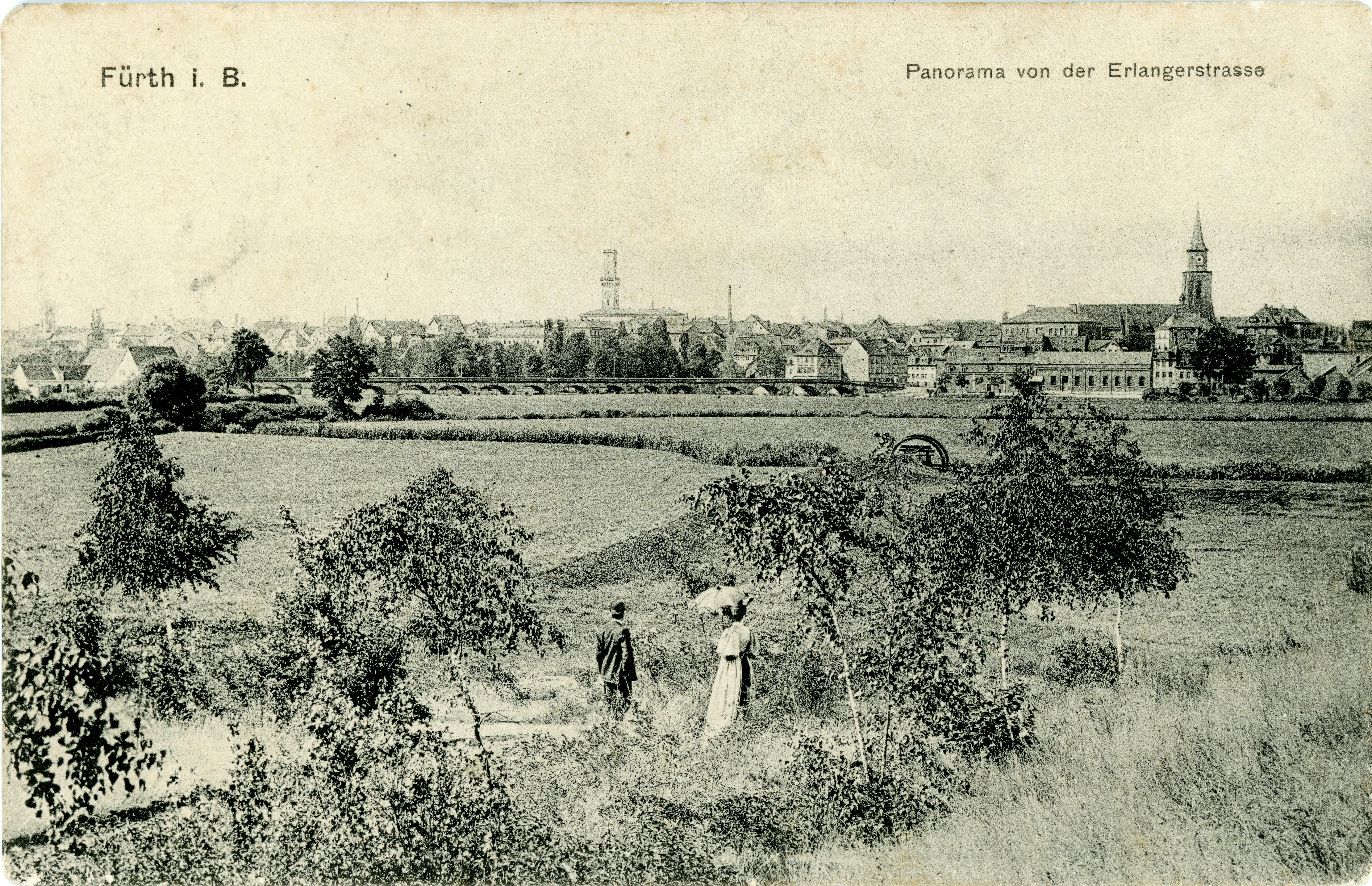 | Beschreibung | Blick vom Abhang an der Erlanger Straße über den Wiesengrund zur Fürther Altstadt - im Hintergrund die Kirche St. Michael und das Fürther Rathaus, datiert 1908 | ||