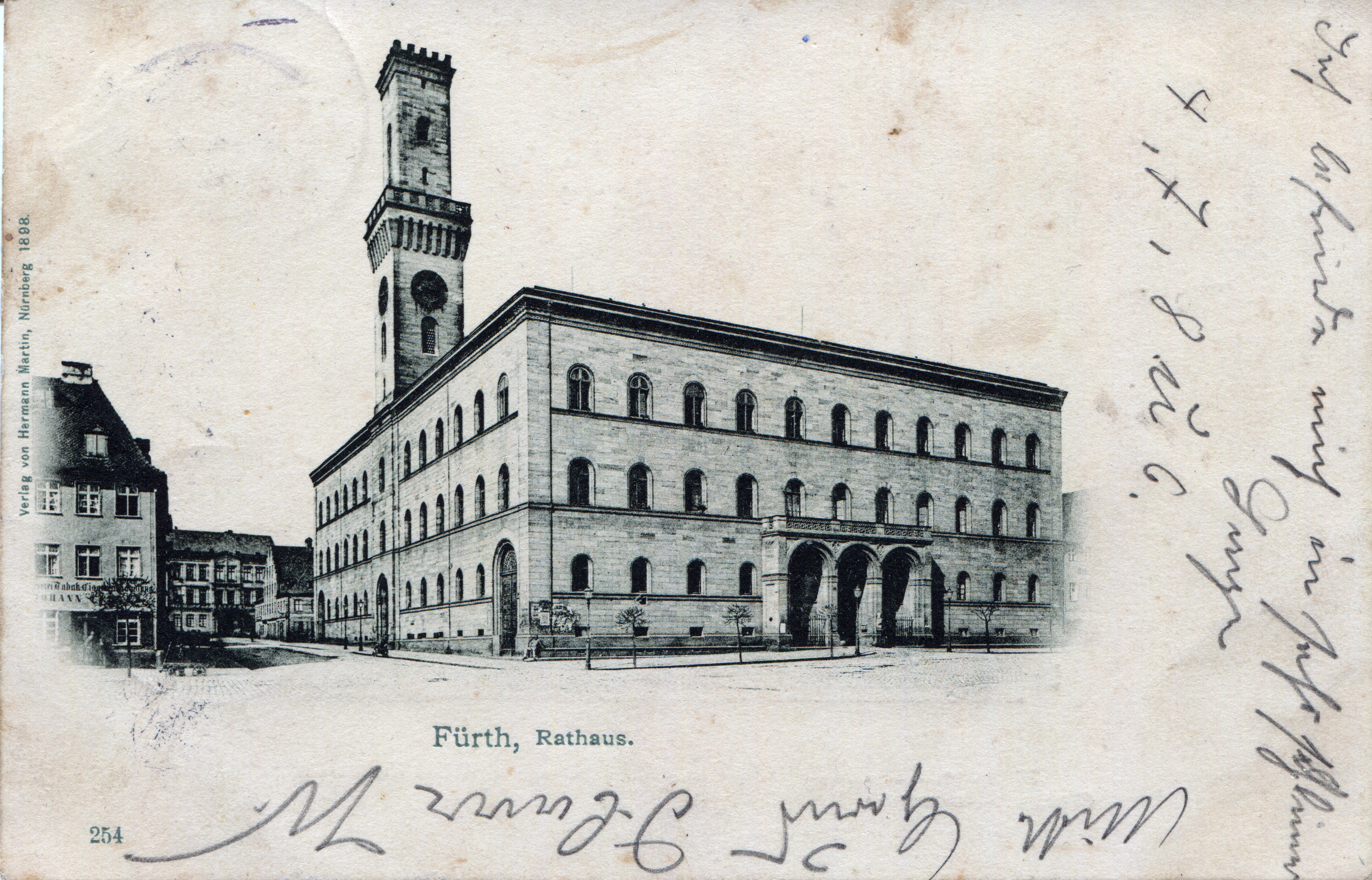 | Beschreibung | Das Rathaus in Fürth, links im Hintergrund das Waßmuth'sche Haus vor dem Abriss für das Kaufhaus Tietz, Postkarte gelaufen im Jahr 1898 | ||