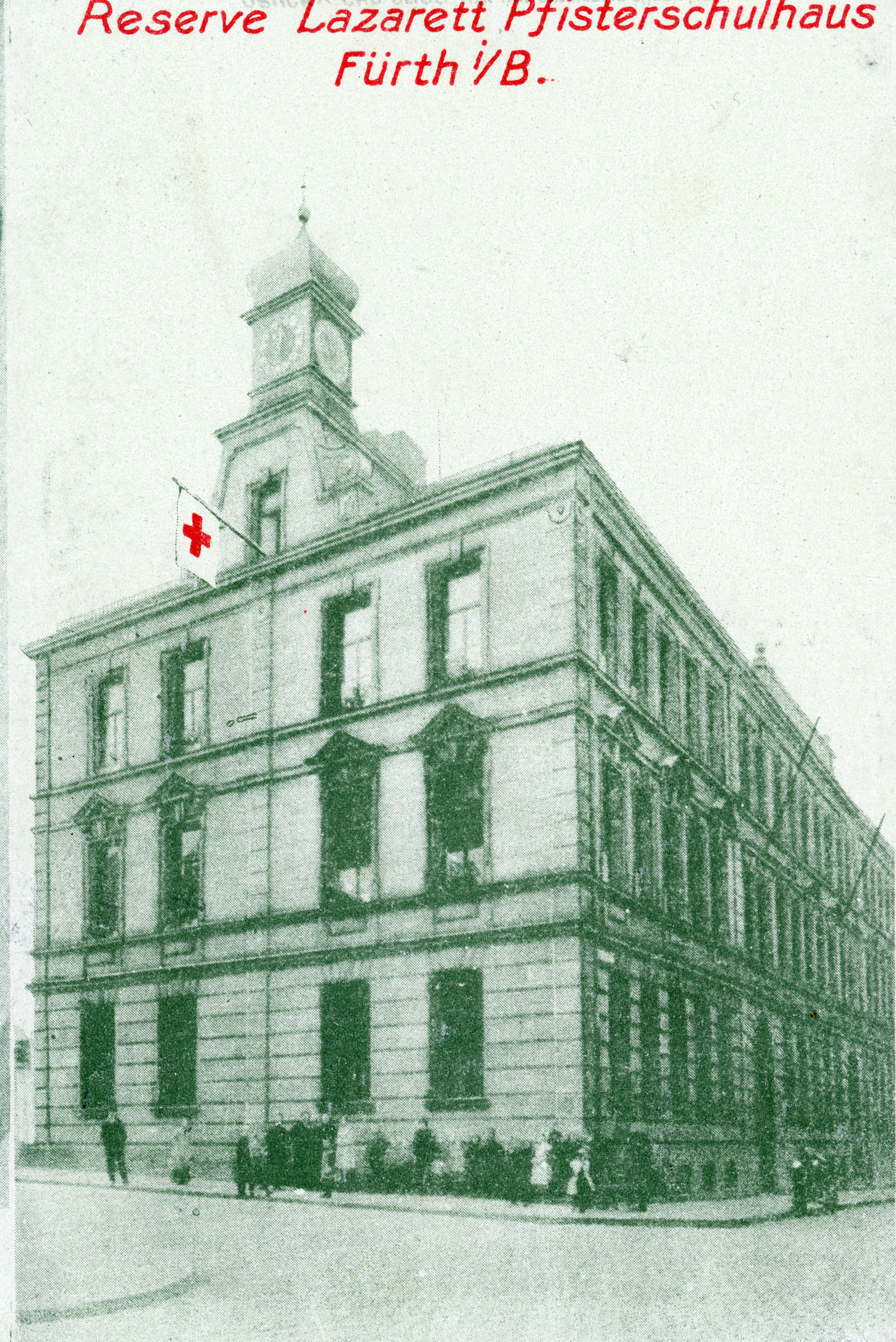 | Beschreibung | Reservelazarett in der Pfisterschule während des 1. Weltkrieges, gel. 1915 | ||
