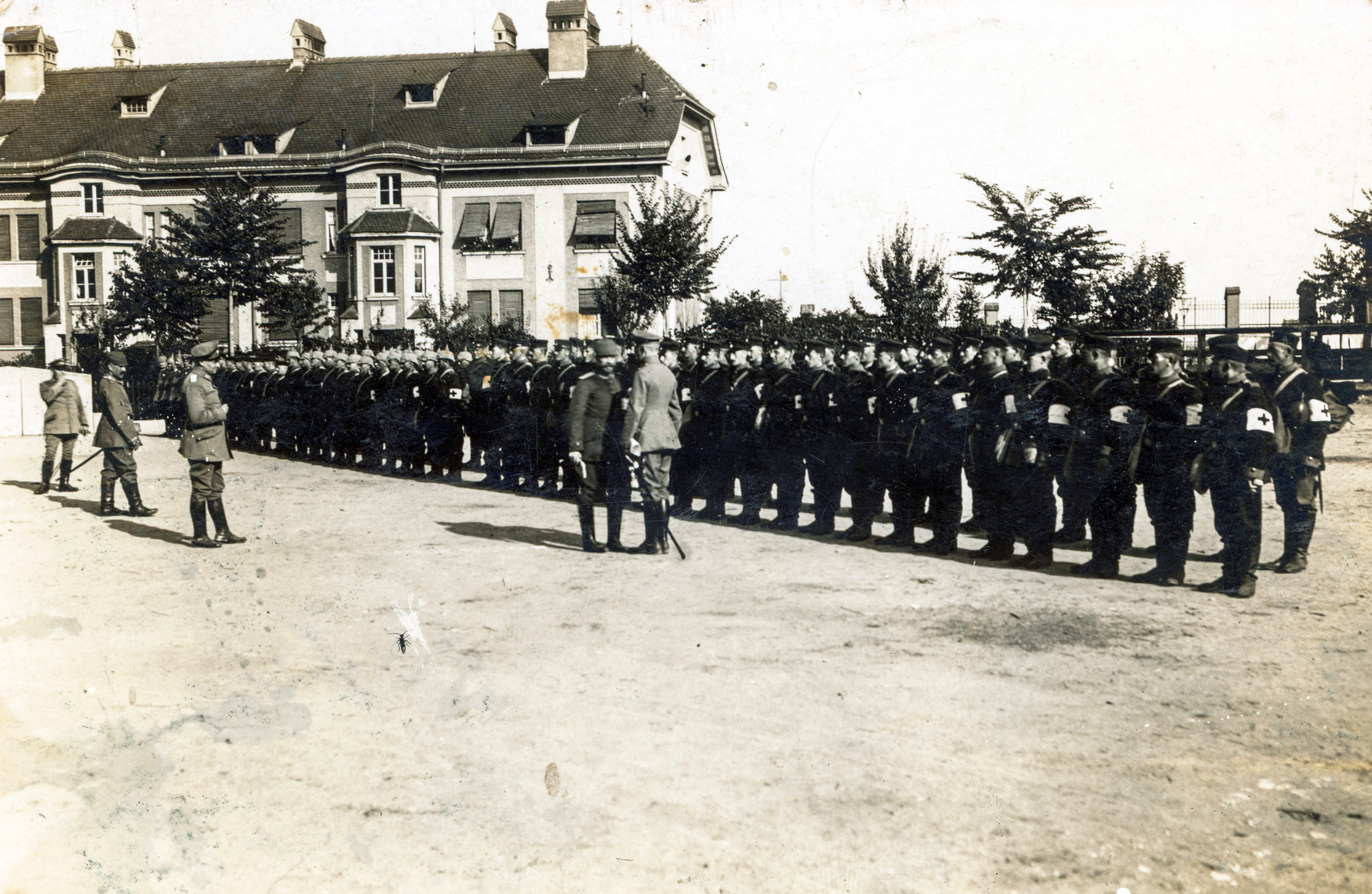 | Dateiinfo (Bild-Unterschrift und Info-Box, automatisch erstellt) | Sanitätstruppe in der Tainkaserne vor Gebäude 85, ngl. ca. 1910 Urheber: unbekannt<br><br>Lizenz: CC BY-SA 4.0 | ||