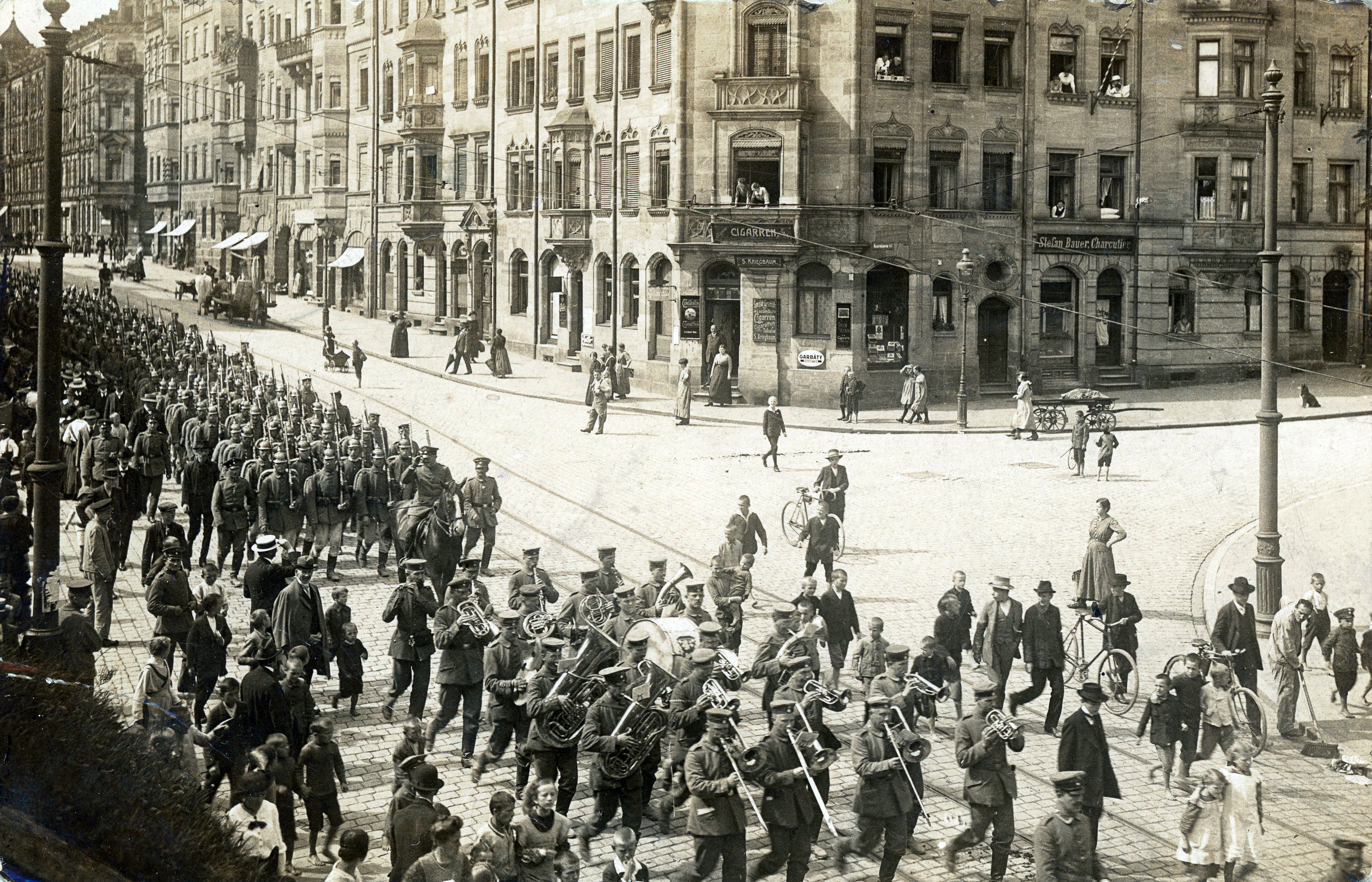 | Beschreibung | Blick auf das Eckhaus Schwabacher Straße/Karolinenstraße 20 während einer Militärparade im 1. Weltkrieg, gel. 1915 | ||