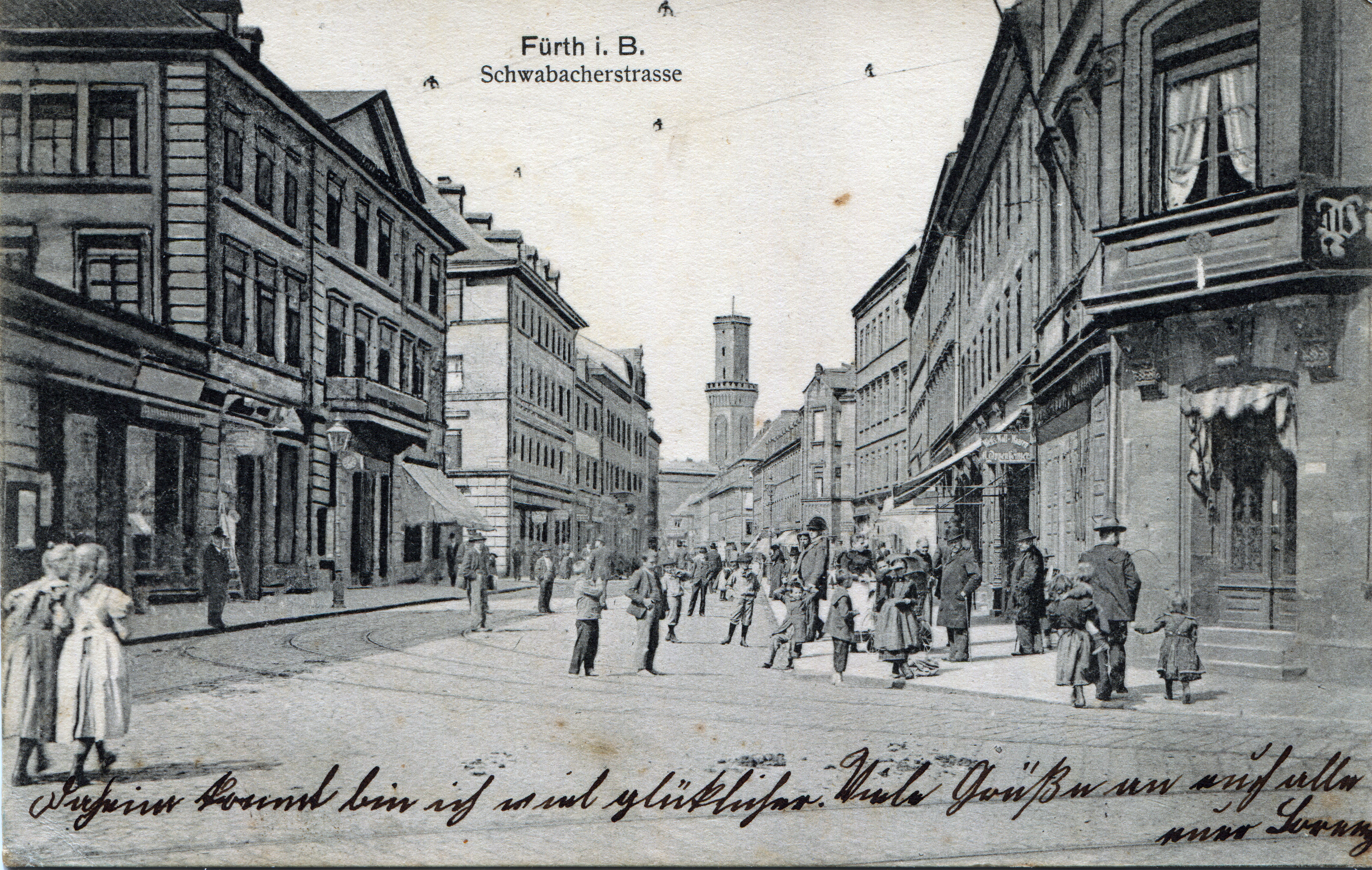 | Dateiinfo (Bild-Unterschrift und Info-Box, automatisch erstellt) | Blick in die Schwabacher Straße mit Passanten und barfüssigen Kindern, ca. 1908 Urheber: unbekannt<br><br><br>Lizenz: CC BY-SA 4.0 | ||