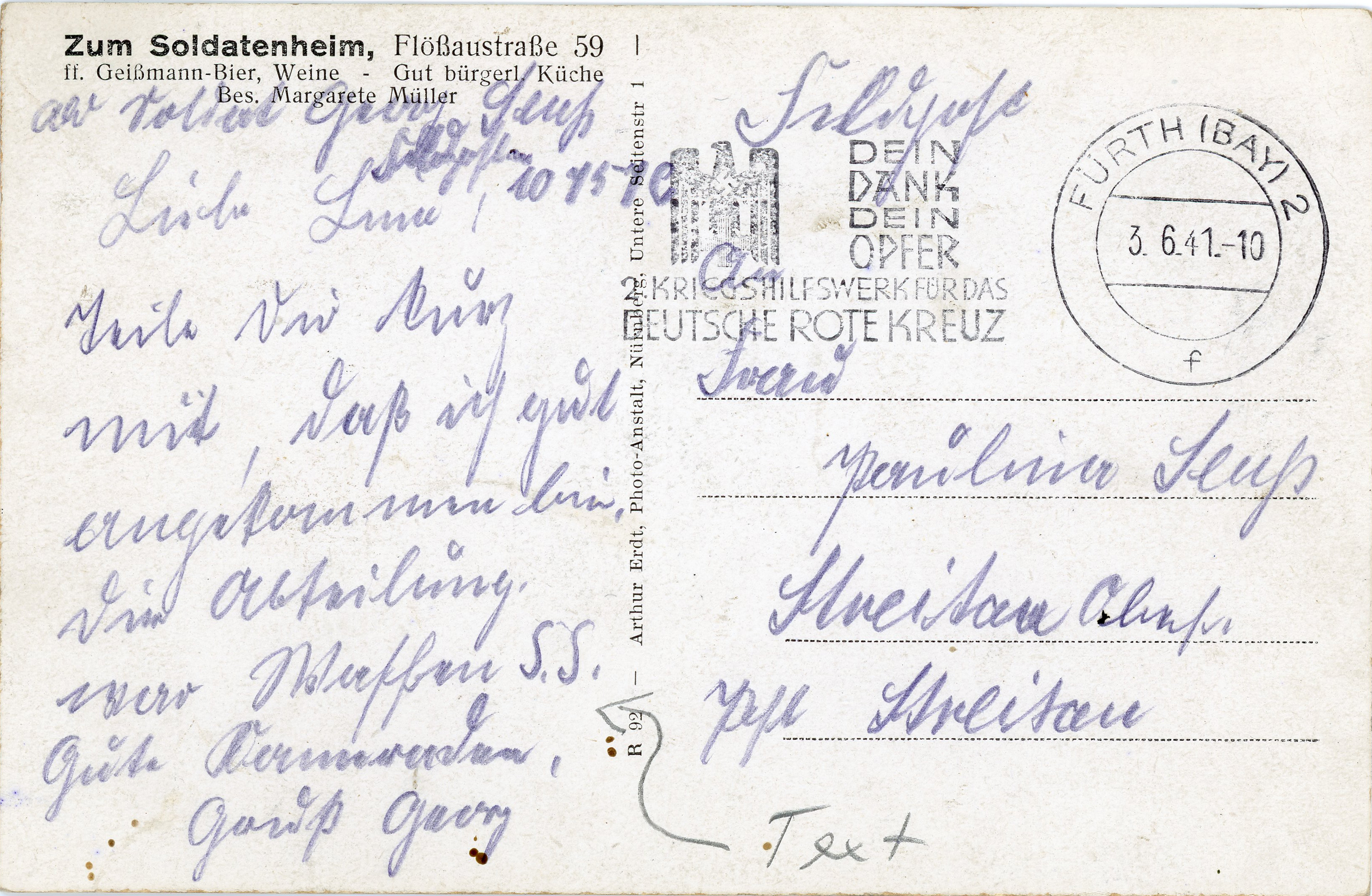 | Beschreibung | Rückseite der Ansichtskarte über die Gaststätte Zum Soldatenheim in der Flößaustraße 59, gel. 1941 | ||