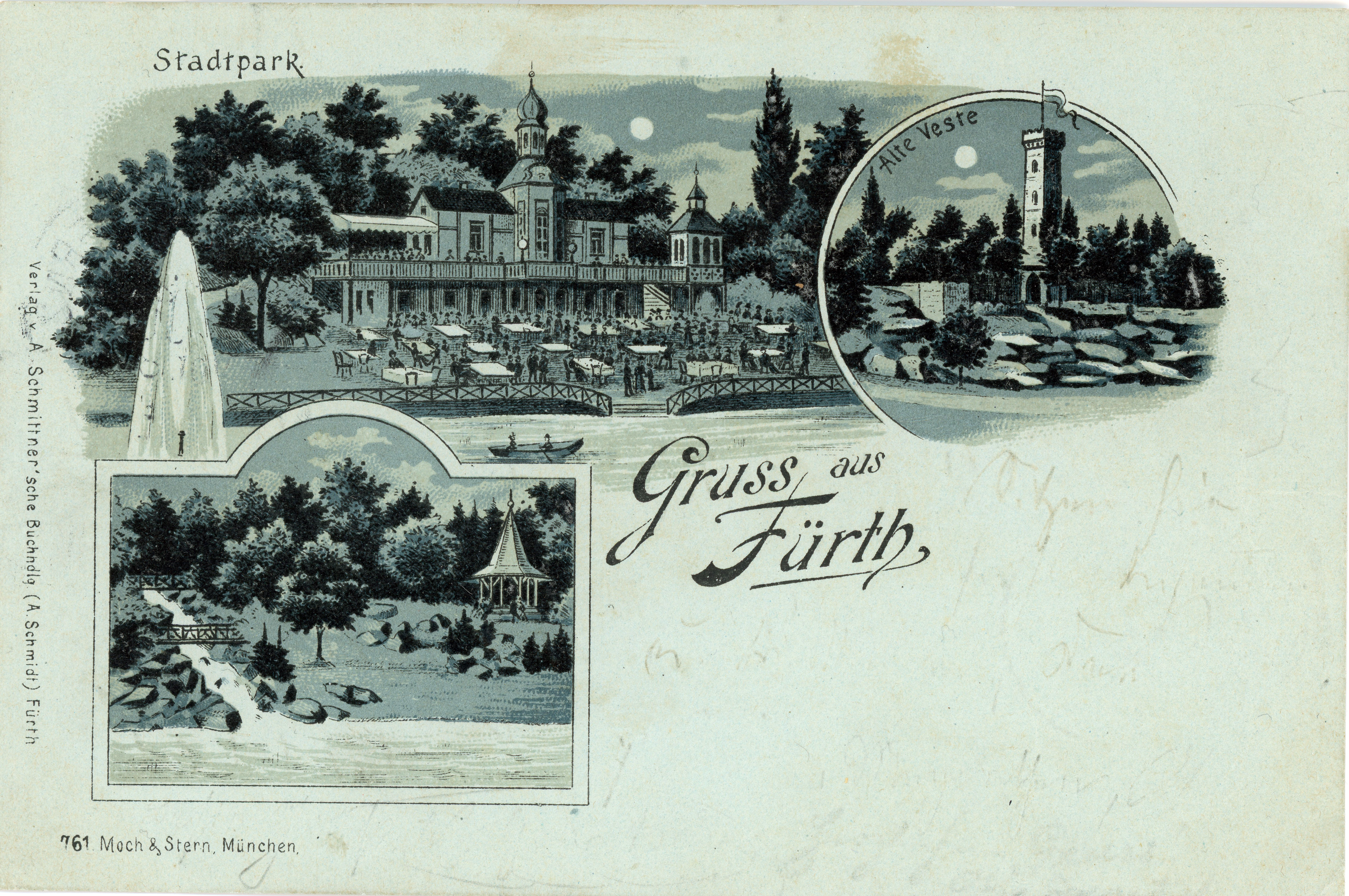 | Dateiinfo (Bild-Unterschrift und Info-Box, automatisch erstellt) | Ansichtskarte mit Motiven des Stadtpark-Restaurants und der alten Veste bei Nacht, gel. 1893 Lizenz: CC BY-SA 3.0 | ||