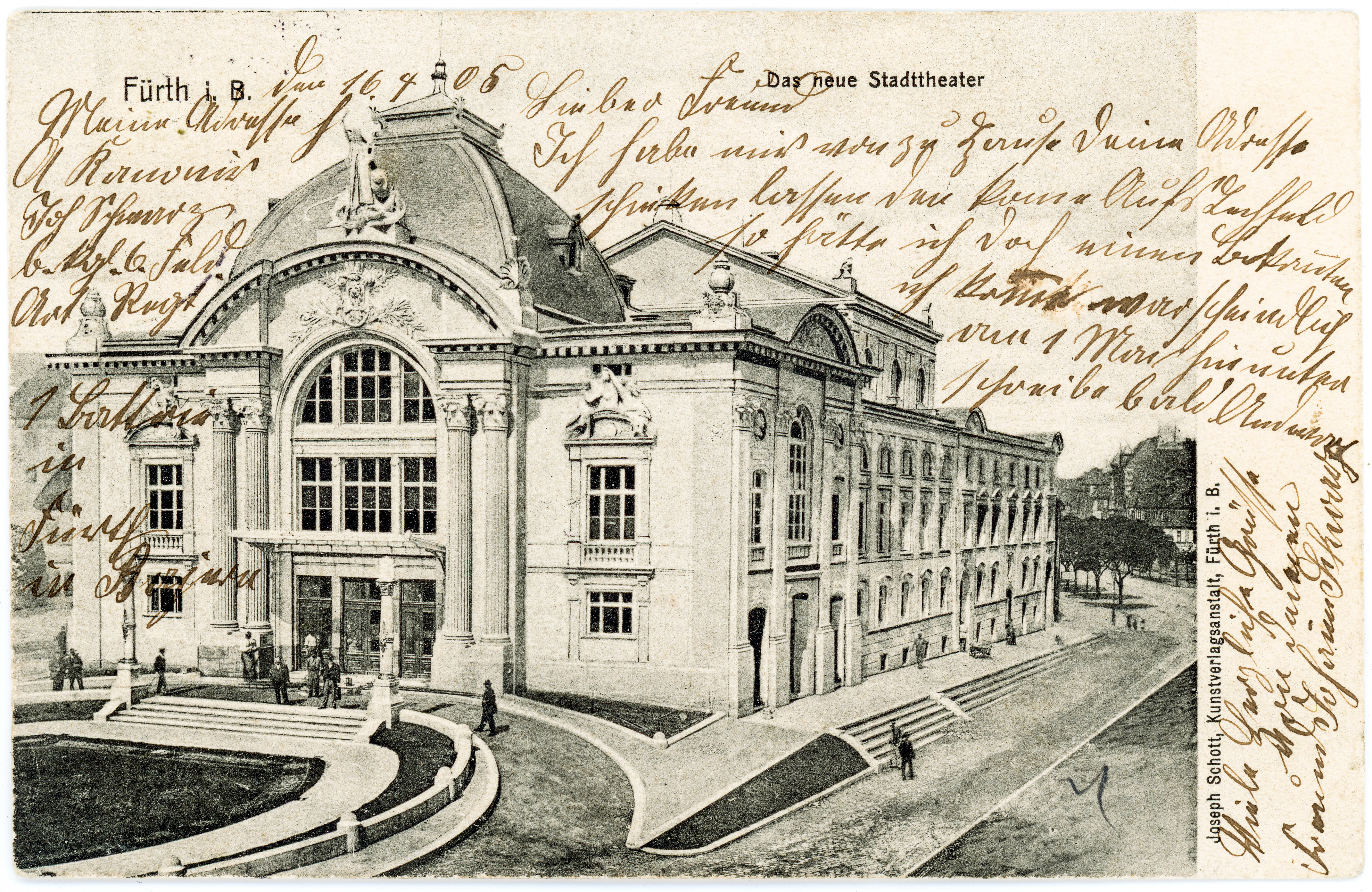 | Dateiinfo (Bild-Unterschrift und Info-Box, automatisch erstellt) | Ansichtskarte vom neuen Stadttheater in Fürth, gel. April 1905 Urheber: unbekannt<br><br>Lizenz: CC BY-SA 4.0 | ||