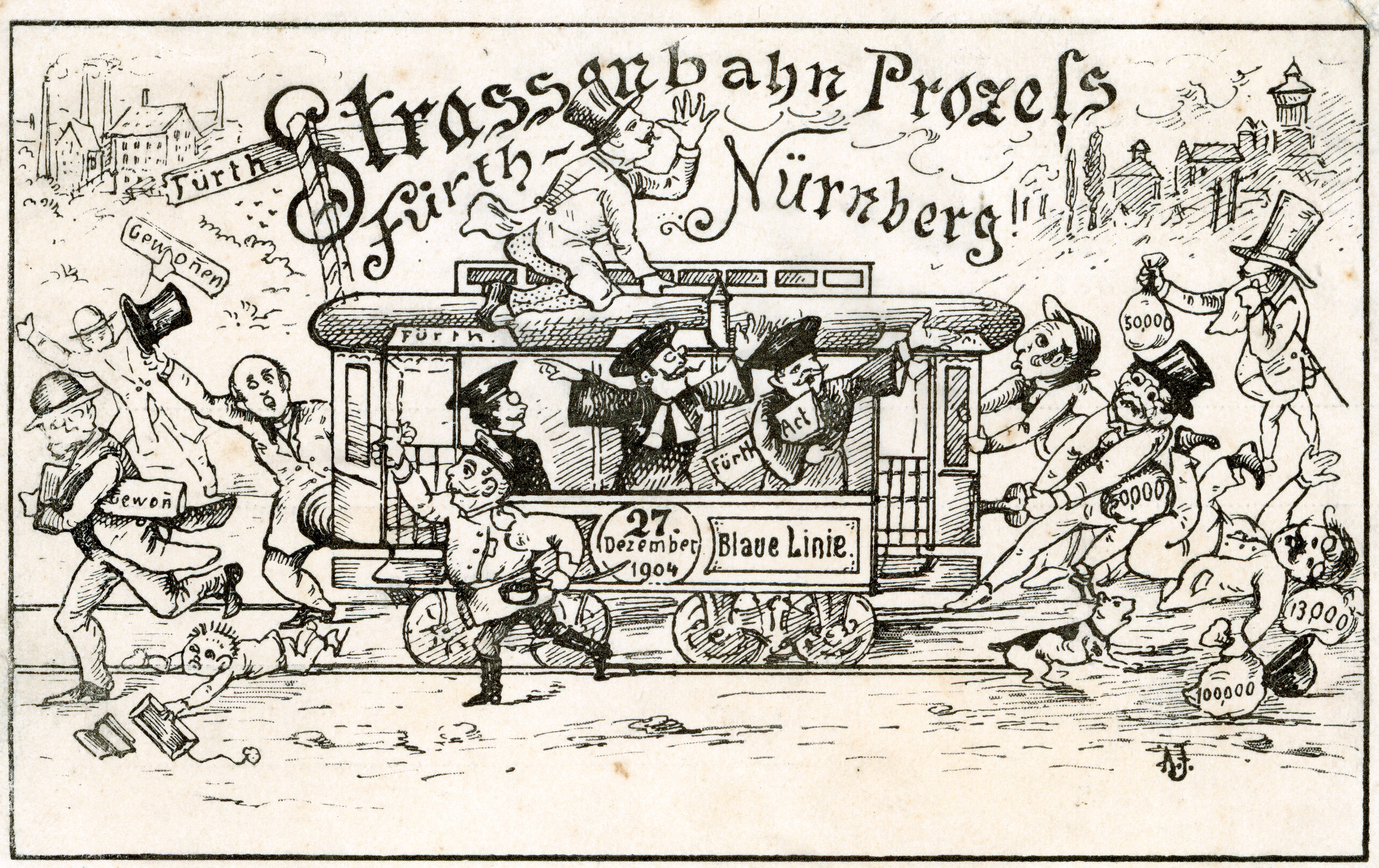 | Beschreibung | Ansichtskarte über den sog. Straßenbahn-Prozess zwischen Nürnberg und Fürth, ngl. 27 Dez 1904 | ||