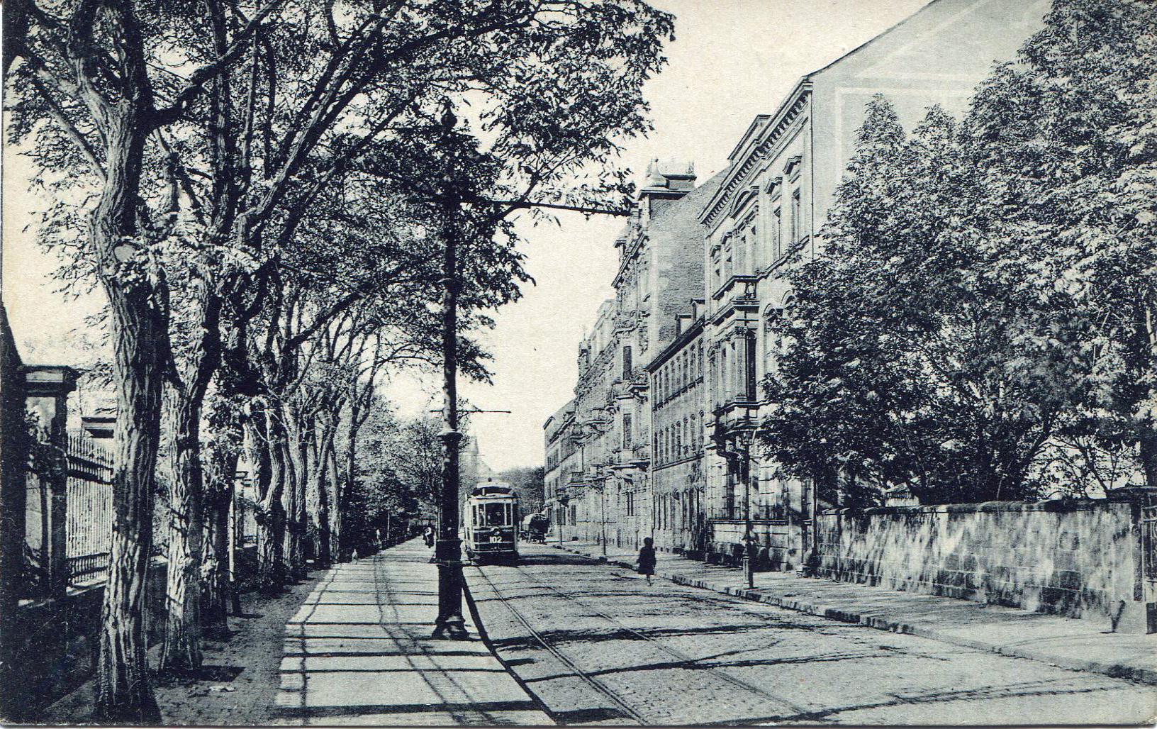 | Beschreibung | Blick in die ehem. Weinstraße - heute Rudolf-Breitscheid-Straße. Links die Einzäunung der Ludwigsbahn-Trasse, rechts das Jakob-Frank-Haus (Rudolf-Breitscheid-Straße 29), dahinter Rudolf-Breitscheid-Straße 27, ca. 1910 | ||