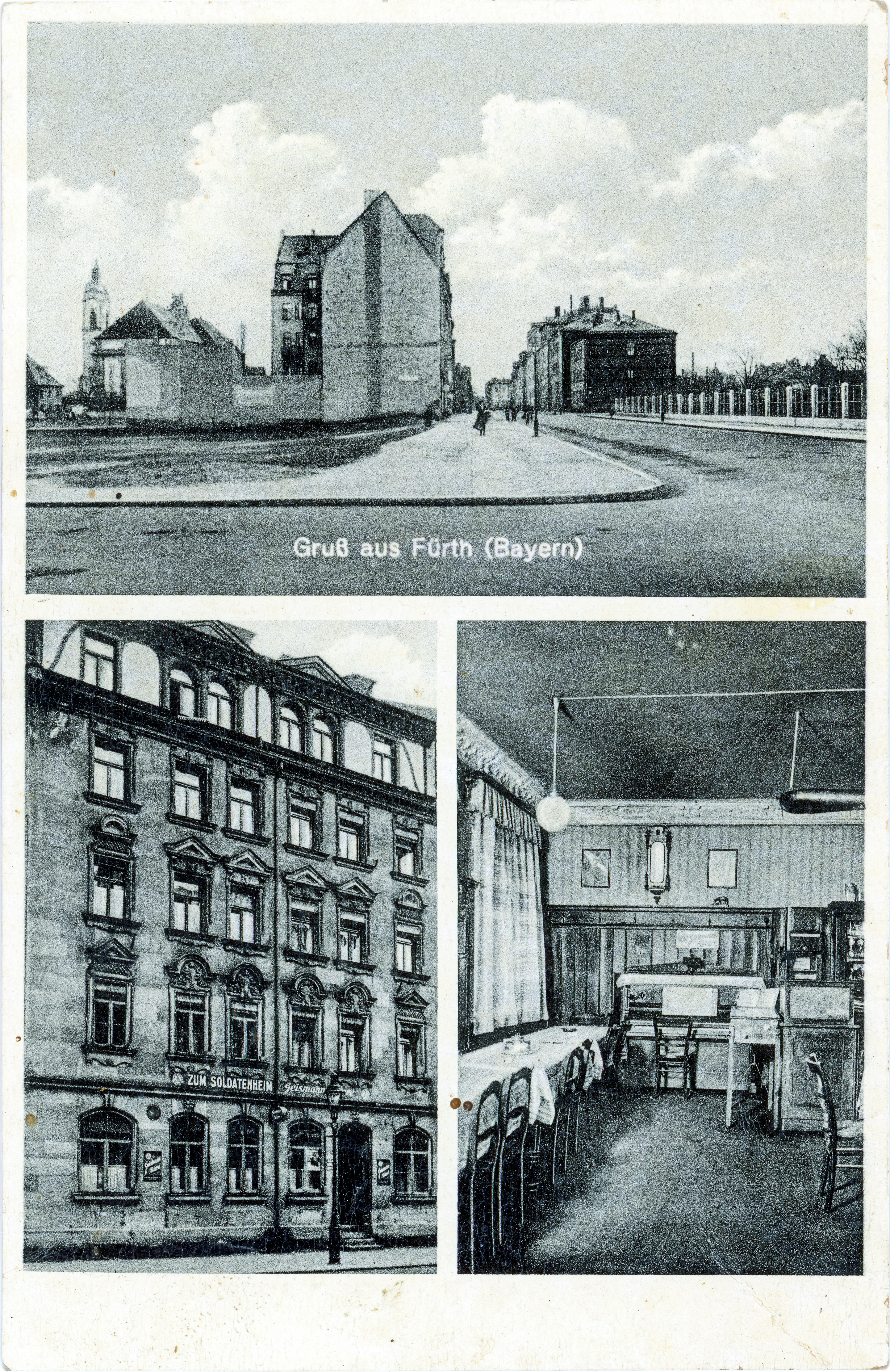 | Beschreibung | Ansichtskarte über die Gaststätte Zum Soldatenheim in der Flößaustraße 59 mit Geismann Bier-Werbung, gel. 1941 | ||
