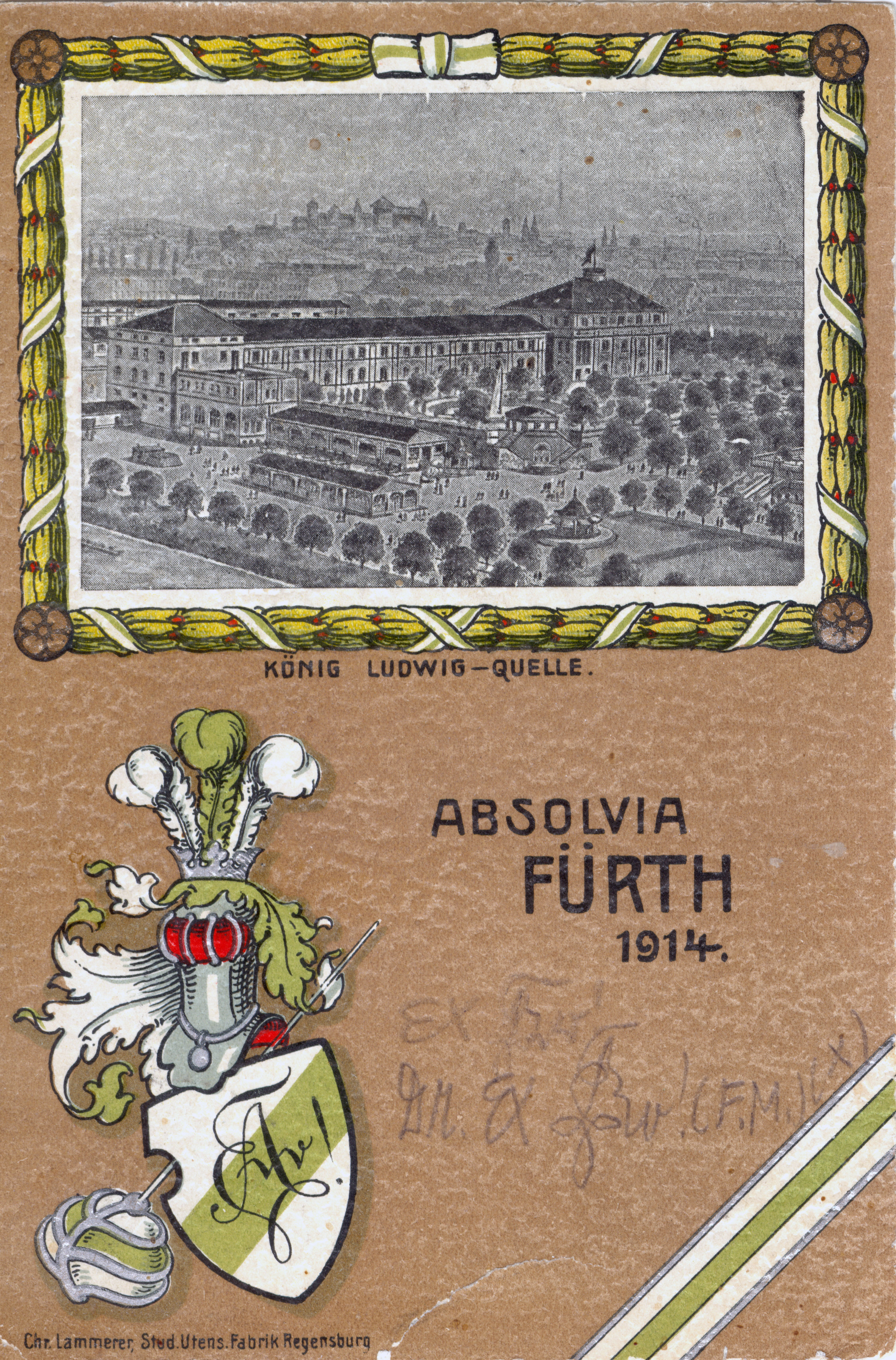 | Dateiinfo (Bild-Unterschrift und Info-Box, automatisch erstellt) | Absolvia Fürth, 1914; Postkarte vom Schlusskommers Urheber: Chr. Lammerer, Regensburg<br>Lizenz: CC BY-SA 3.0 | ||