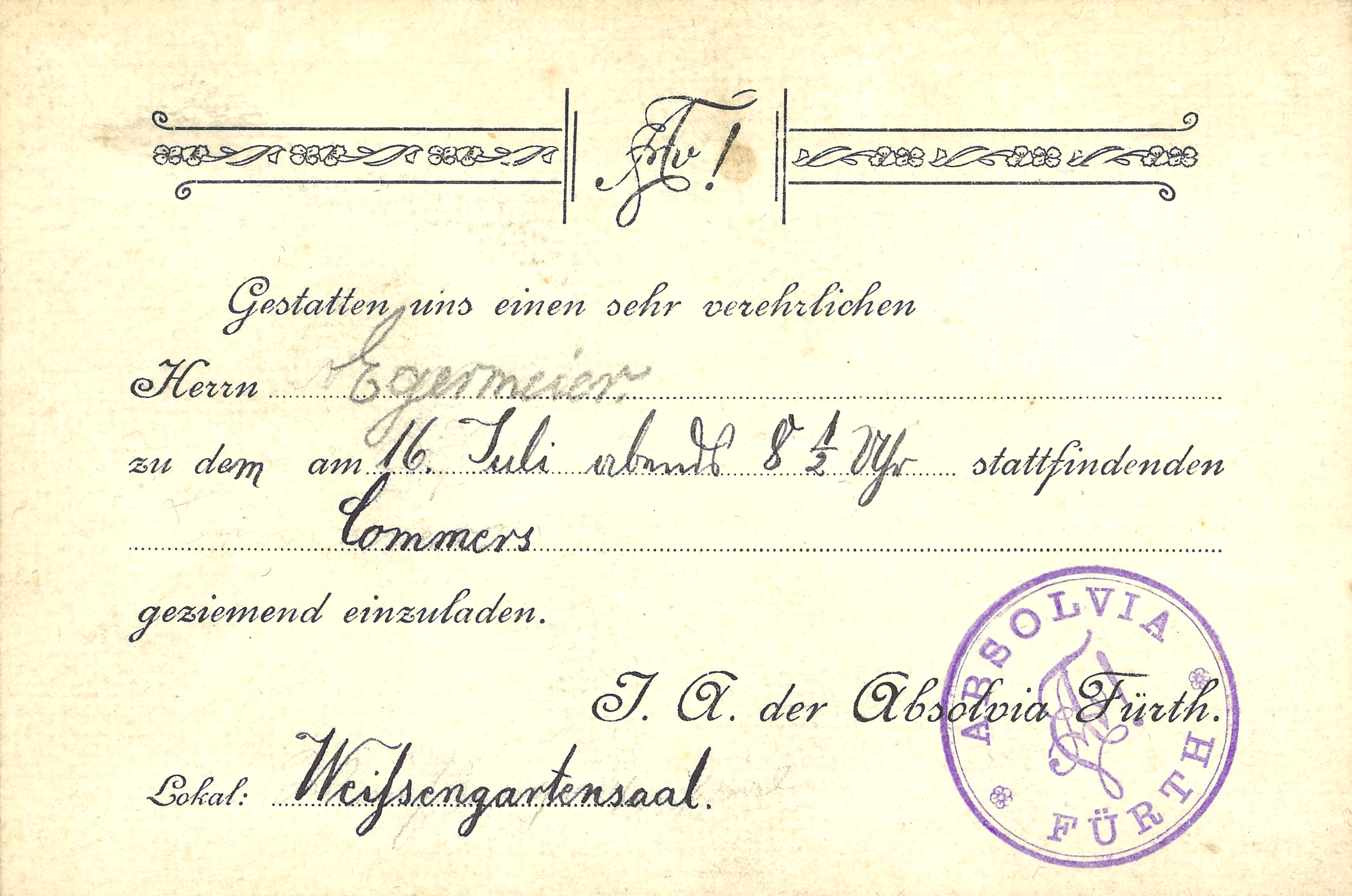 | Beschreibung | Einladungskarte der Absolvia zu einem "Commers" im Weißengartensaal, um 1910 | ||