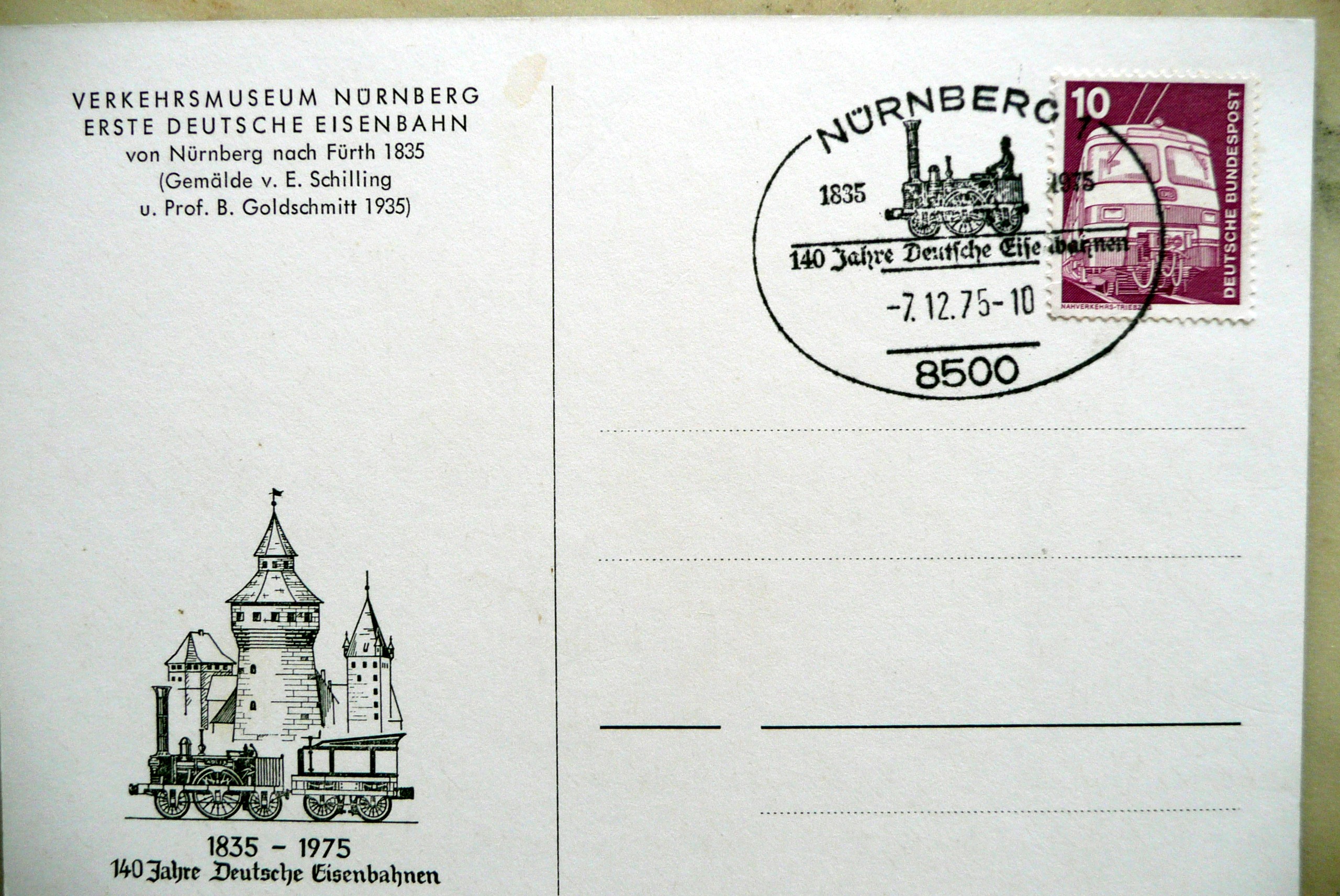 | Beschreibung | Sonderstempel Lokomotive Adler zum Jubiläum "140 Jahre Deutsche Eisenbahn 1835-1975" | ||