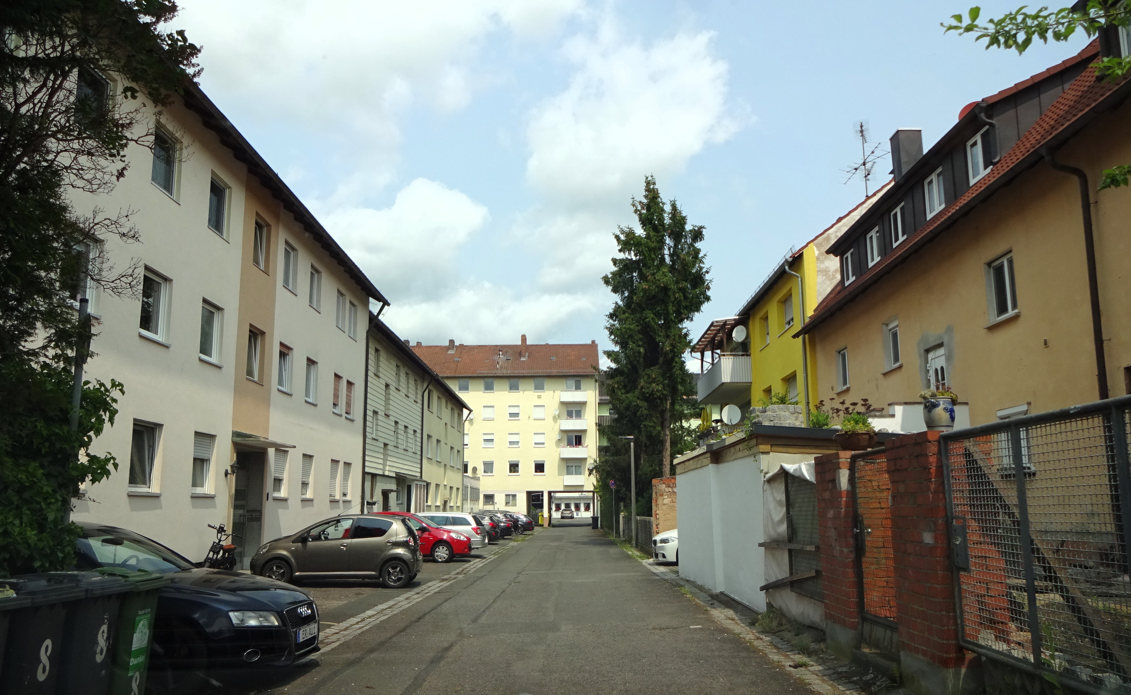 | Beschreibung | Blick von der Ahornstraße zur Waldschänke, rechts Gebäude Westliche Waldringstraße Rückseiten, 2025 | ||