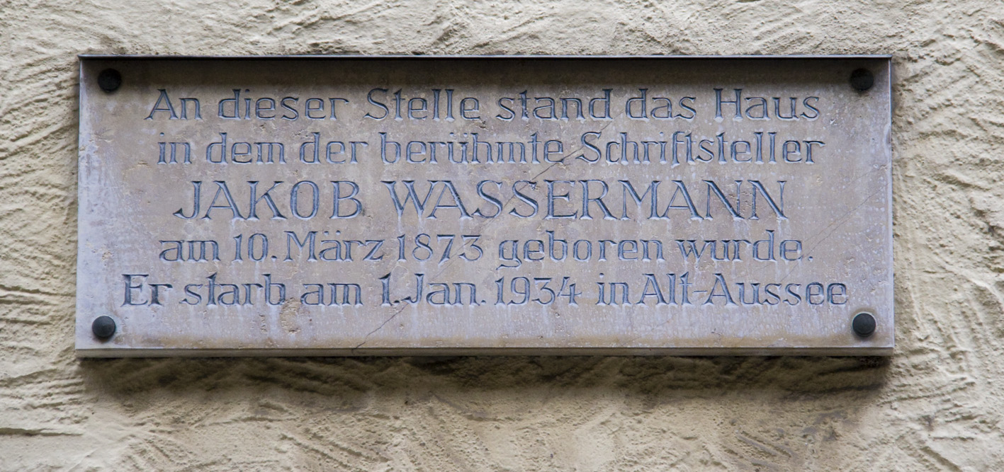 | Beschreibung | Gedenktafel zu Ehren von Jakob Wassermann am ehem. Geburtshaus in der Alexanderstraße 13 | ||