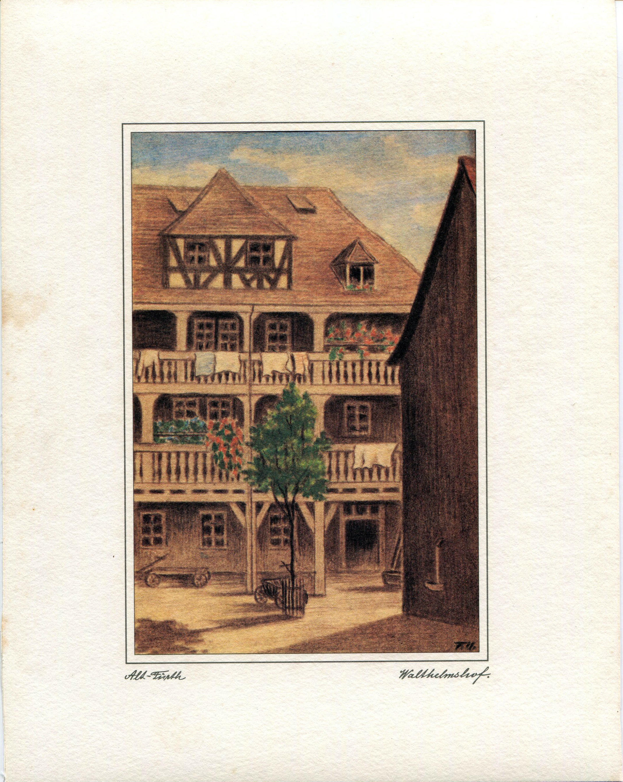 | Beschreibung | Zeichnung des sog. Walthelmshof (Wasserstr. 1) in Alt-Fürth, 1934 | ||