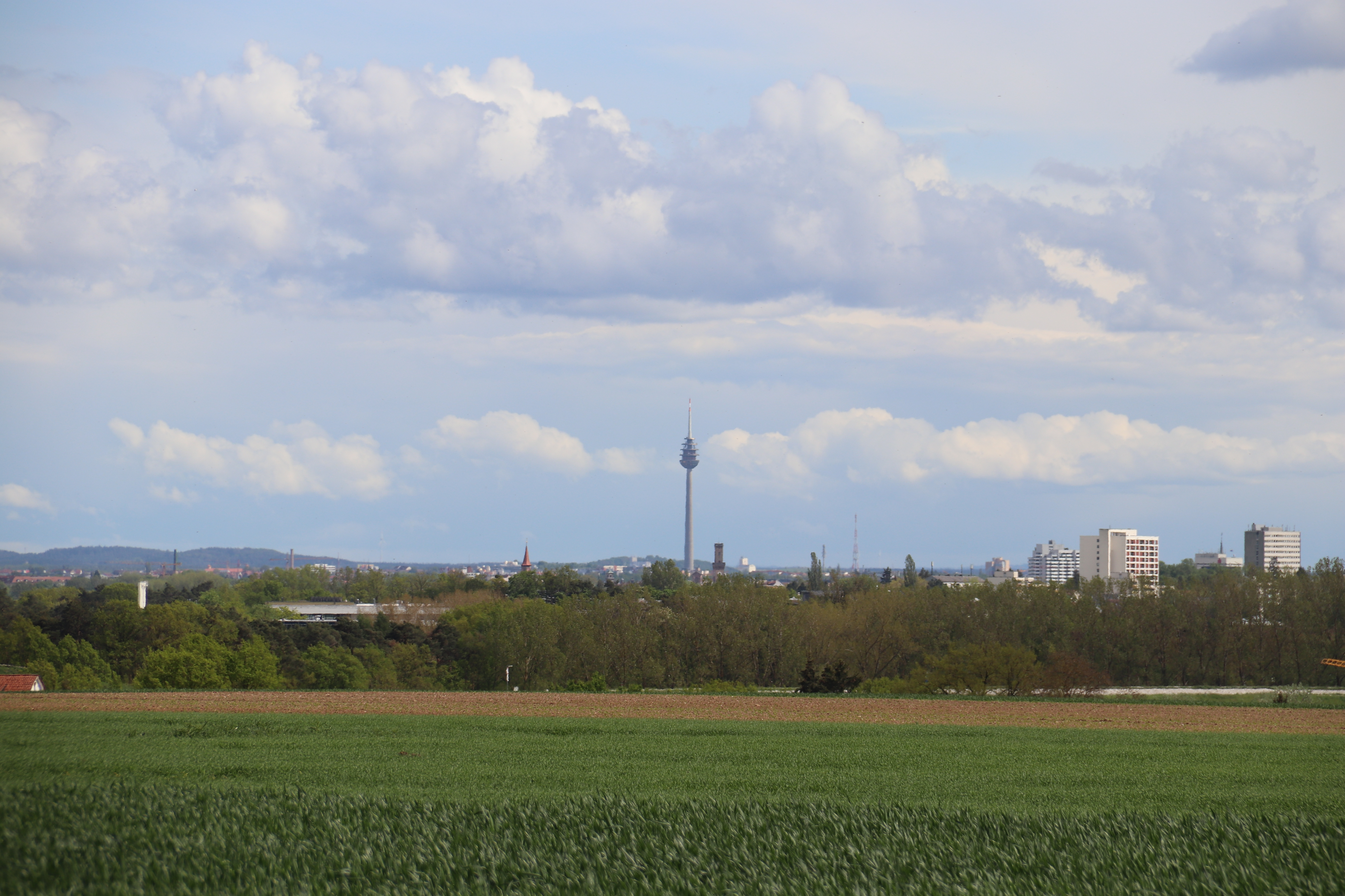 | Beschreibung | Blick vom höchsten Punkt der Butschleite nach Südsüdost, in der Bildmitte der Rathausturm, links daneben der Fernmeldeturm Nürnberg. | ||