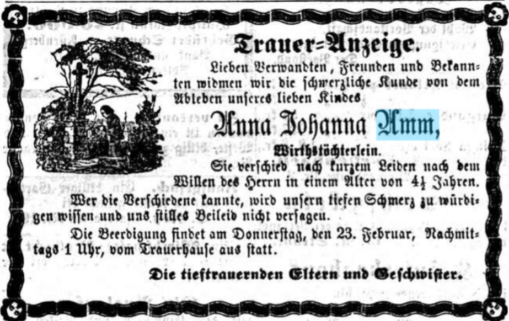 | Dateiinfo (Bild-Unterschrift und Info-Box, automatisch erstellt) | Todesanzeige für Anna Johanna Amm, Februar 1871 Lizenz: NoC-NC 1.0 | ||
