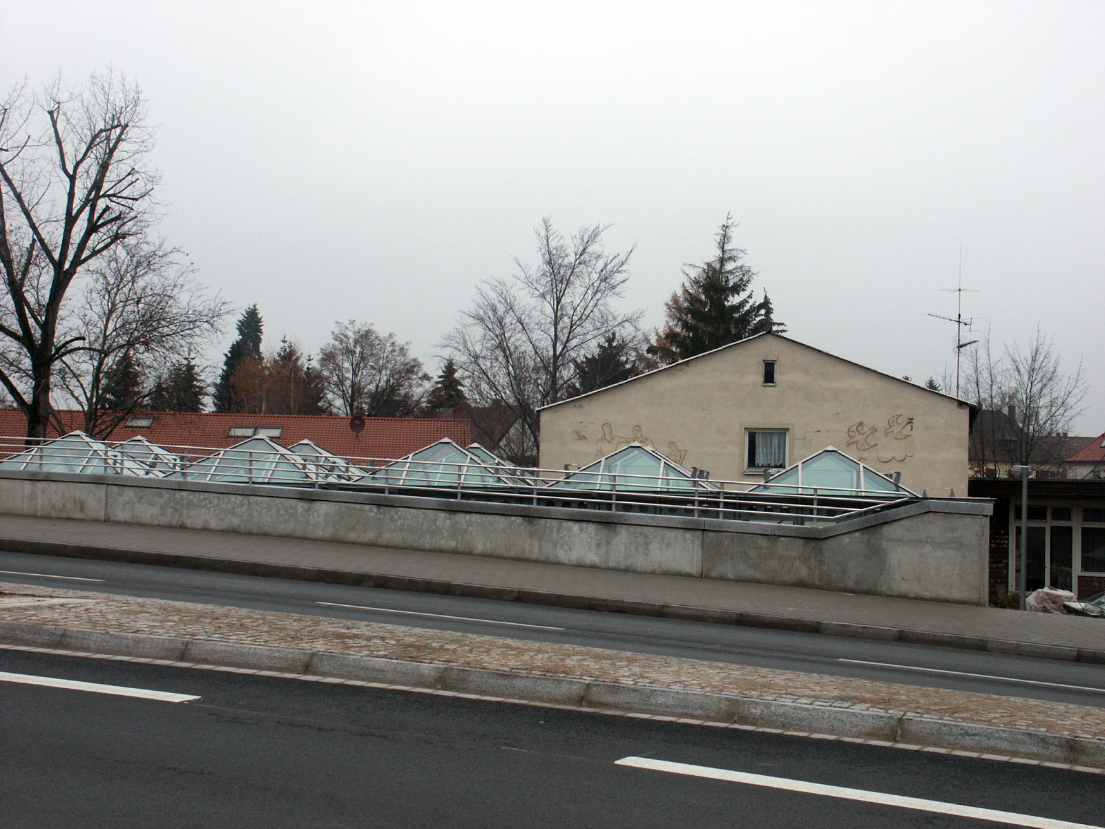 | Beschreibung | Ehem. Kinderhort der Arbeiterwohlfahrt mit Sgraffiti an der Fassade, inzwischen durch ein Neubau ersetzt, 2004 | ||