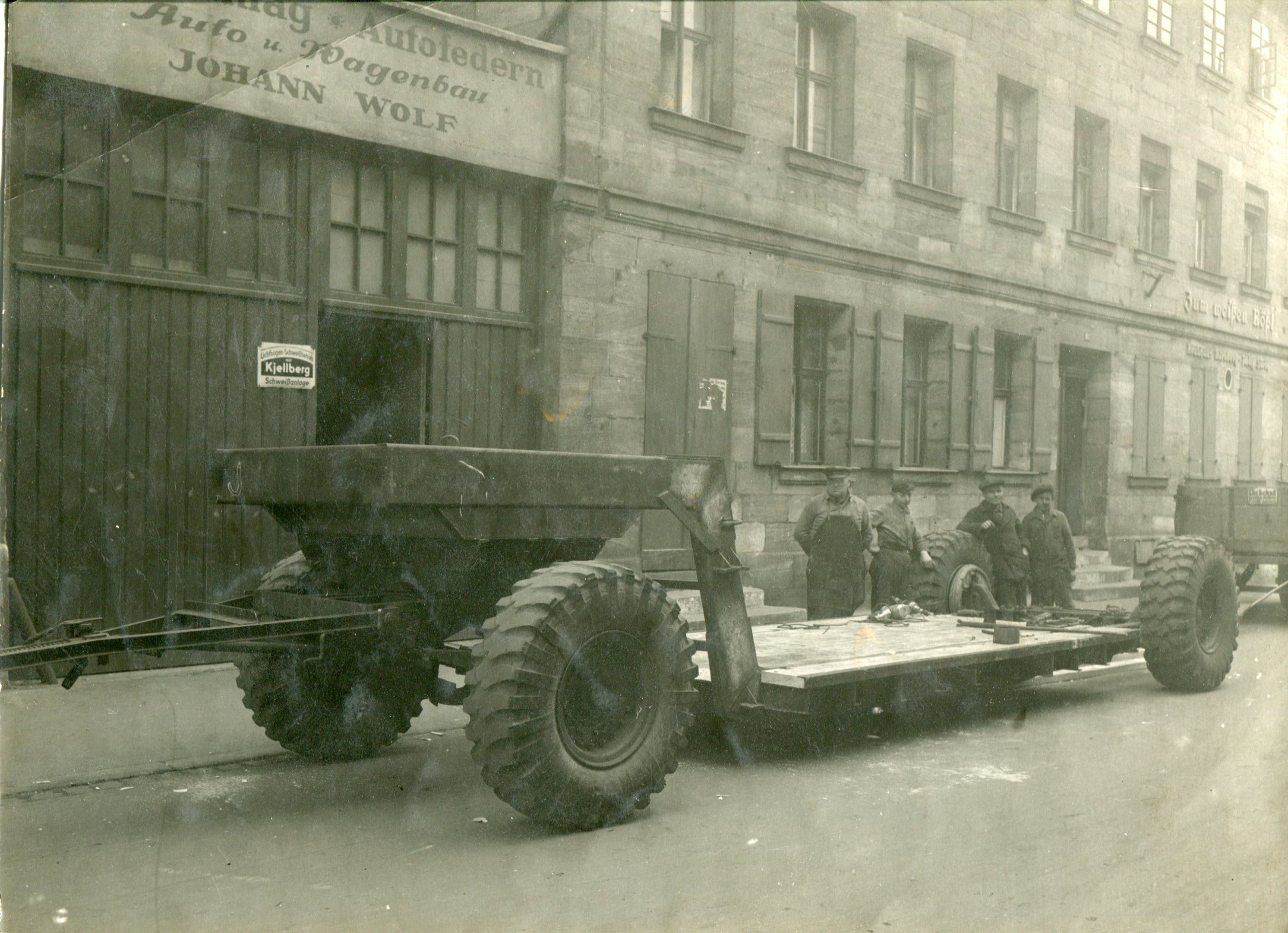 | Beschreibung | Anhänger und Belegeschaft vor der Werkstatt Johann Wolf, 1930er Jahre | ||