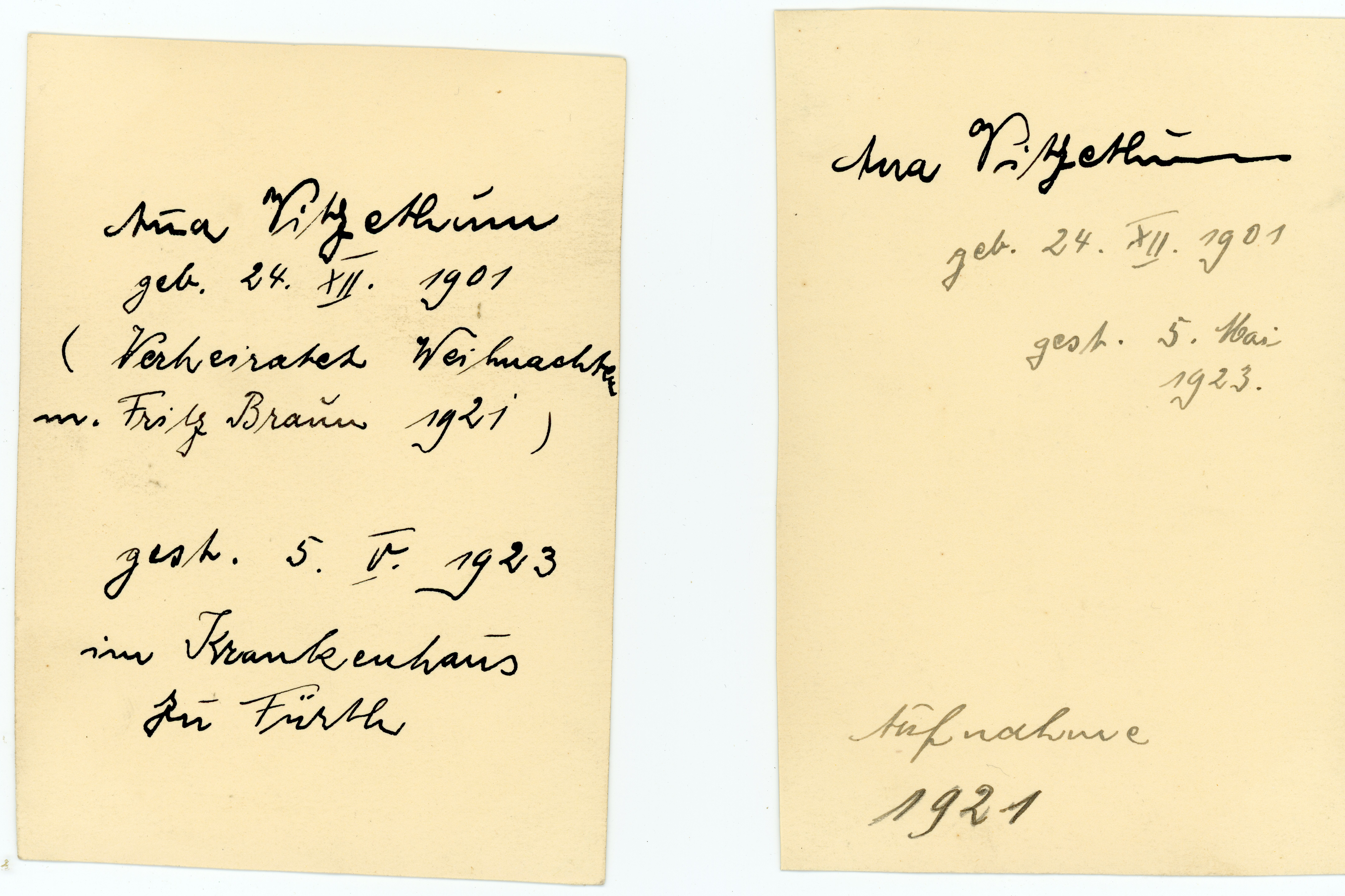 | Beschreibung | Anna Braun, geb. Vitzethum – rückseitige Beschriftung der Fotos von Ferdinand Vitzethum, 1907 und 1921 | ||
