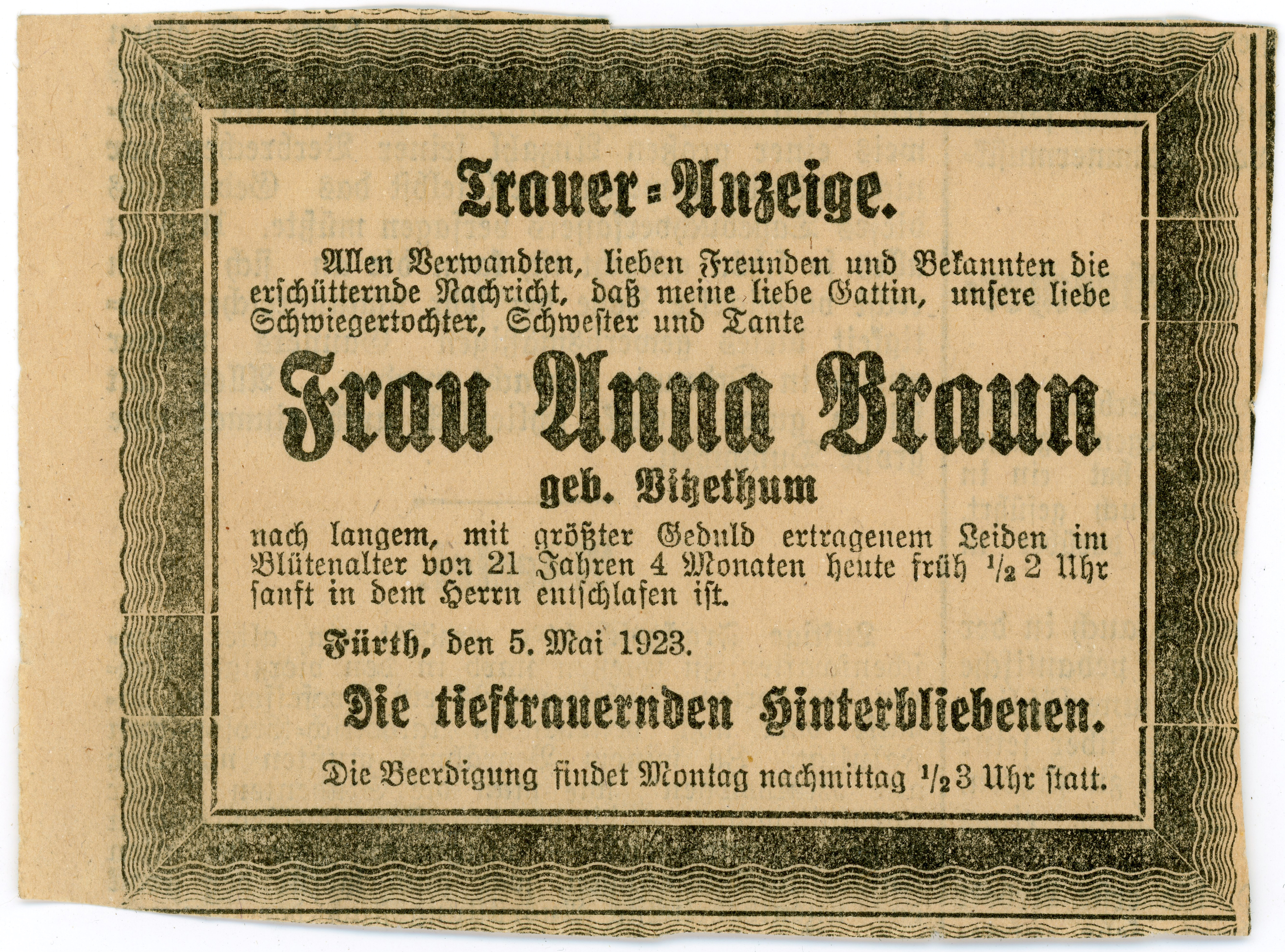 | Beschreibung | Anna Braun, geb. Vitzethum, Traueranzeige 1923 | ||