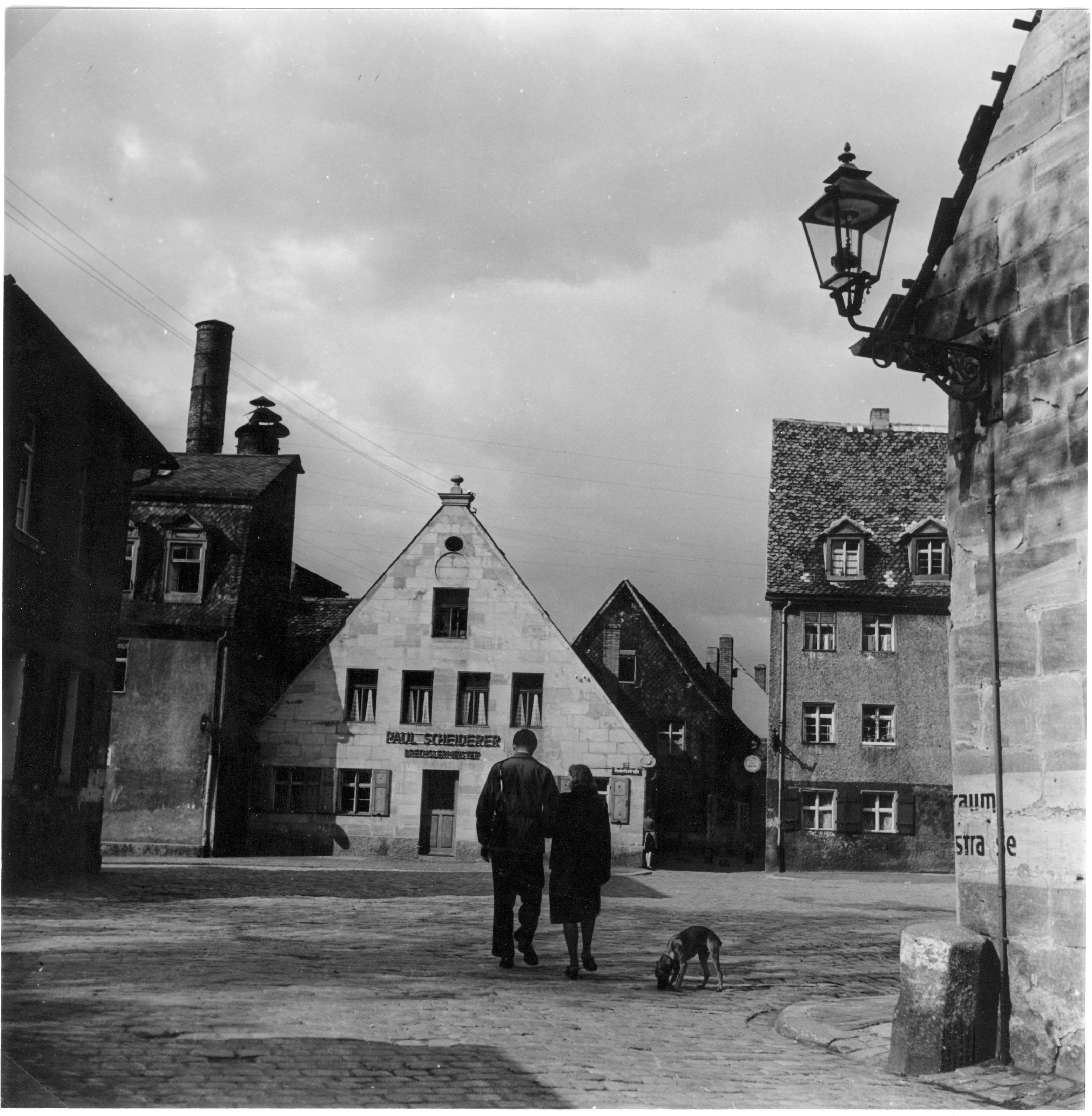 | Beschreibung | Blick aus der Schlehenstraße auf Rednitzstraße 23 (Bildmitte), rechts davon Rednitzstraße 25, dazwischen im Hintergrund Schützenhof 10. Rechts Scheunenecke mit Gaslaterne Rednitzstraße 34 (Schoder), 1949 | ||