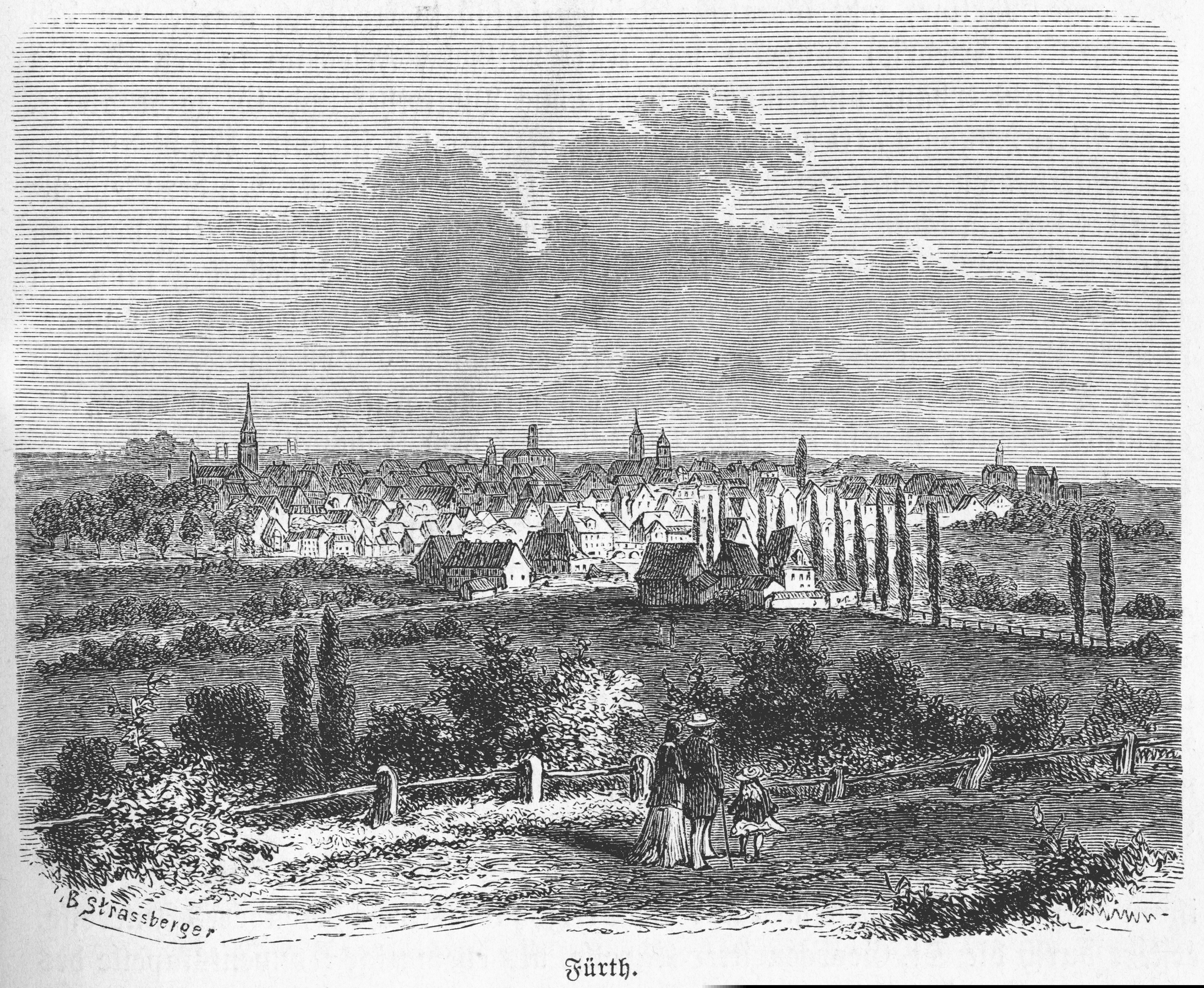 | Dateiinfo (Bild-Unterschrift und Info-Box, automatisch erstellt) | Ansicht von Fürth, Holzstich, 1879 Urheber: B. Strassberger<br><br>Lizenz: PDM | ||