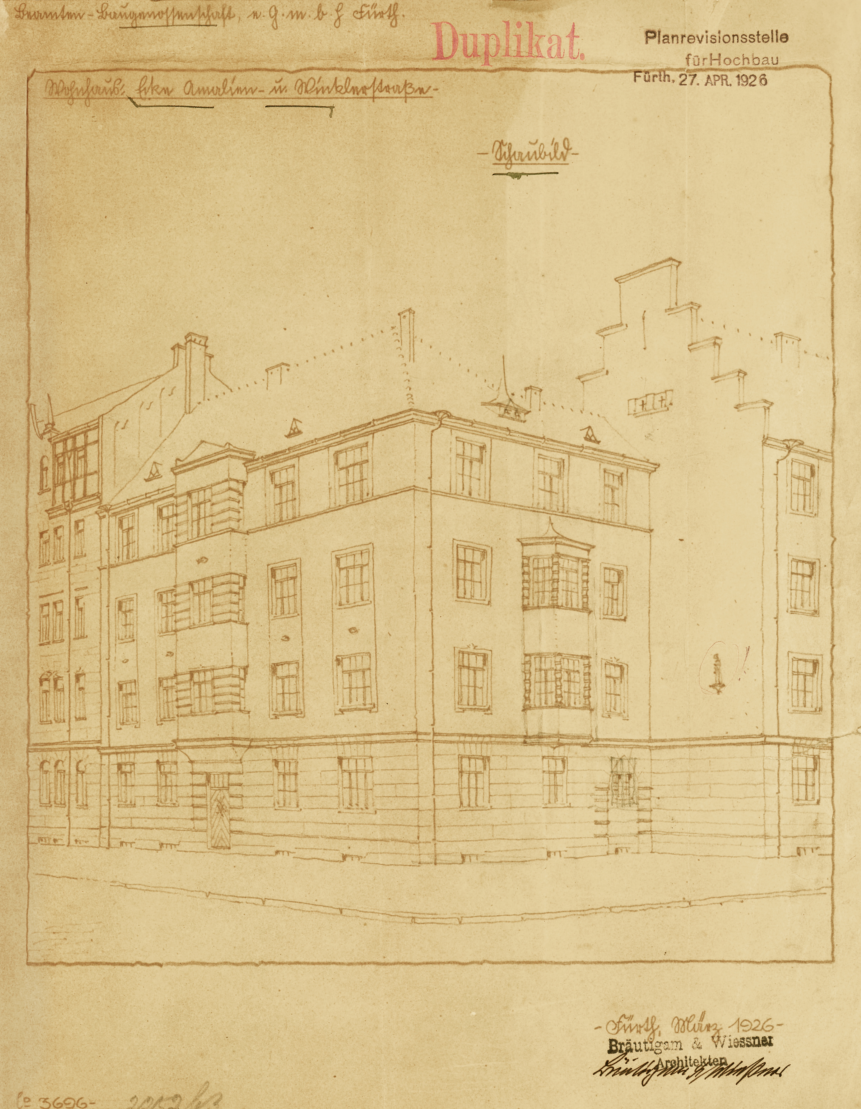 | Beschreibung | Ansichtsplan bzw. Skizze der Außenansicht des Wohngebäudes Amalienstraße 68 von 1926 | ||