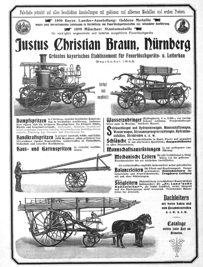 | Dateiinfo (Bild-Unterschrift und Info-Box, automatisch erstellt) | Anzeige in Festzeitung zum IX. Bayer. Feuerwehrtag in Fürth, August 1900 Urheber: Justus Christian Braun, Nürnberg<br><br>Lizenz: CC BY-SA 3.0 | ||