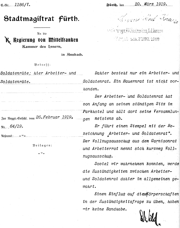 | Beschreibung | Parkhotel als ständiger Sitz der Arbeiter- und Soldatenrates Fürth in der Räterepublik 1918/1919 | ||