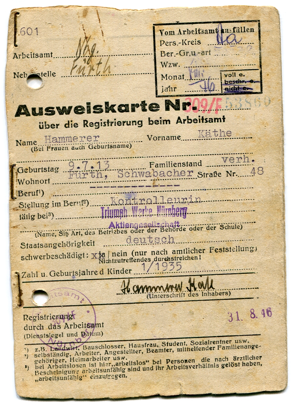 Ausweiskarte vom 31.8.1946 (Stempelkarte) vom Arbeitsamt Fürth mit Zusatzkarte des Ernährungsamt Fürth zur Ausgabe von Lebensmittelmarken