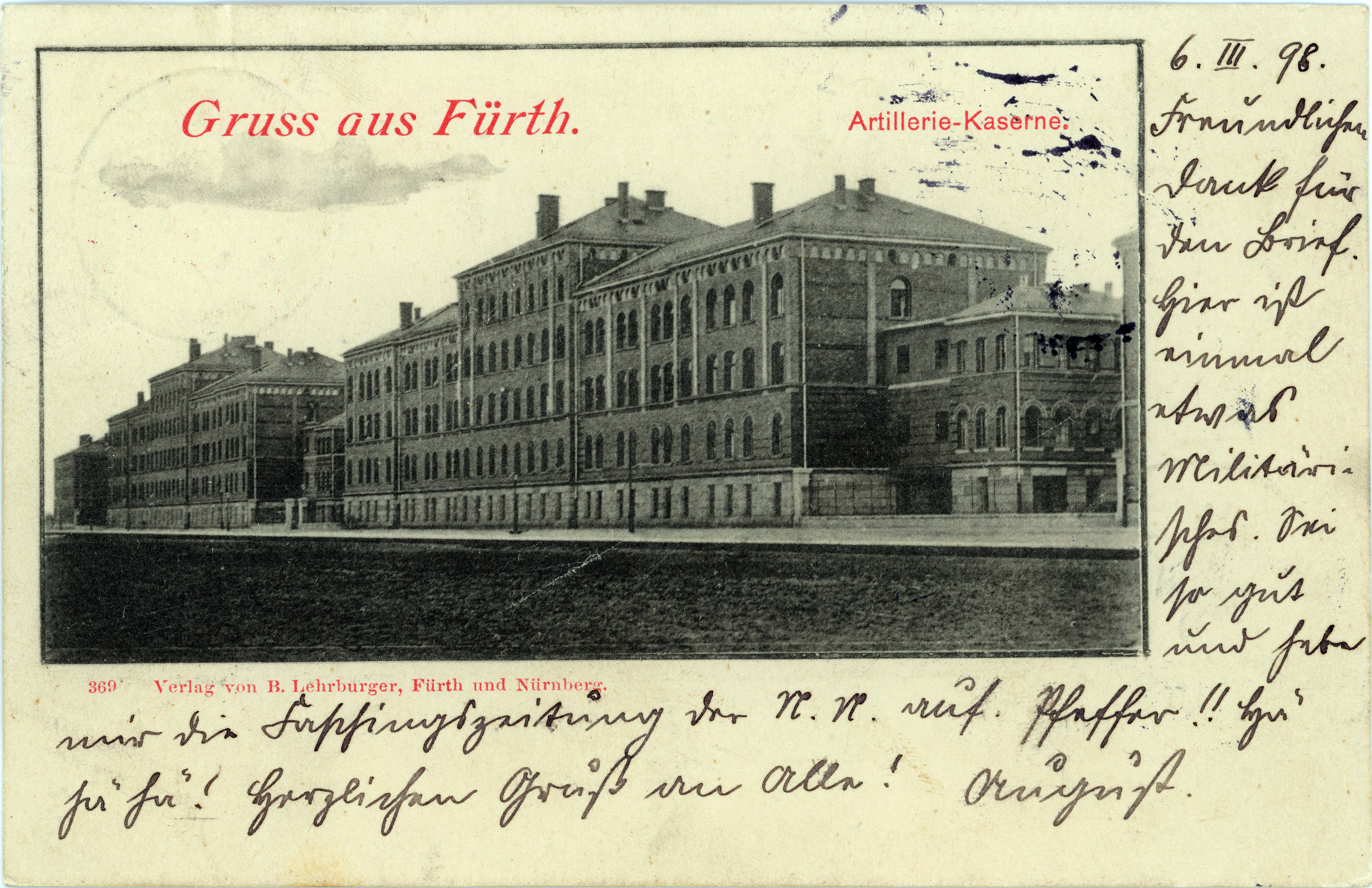 | Beschreibung | Ansichtskarte der Artilleriekaserne in der Südstadt, gel. 1898 | ||
