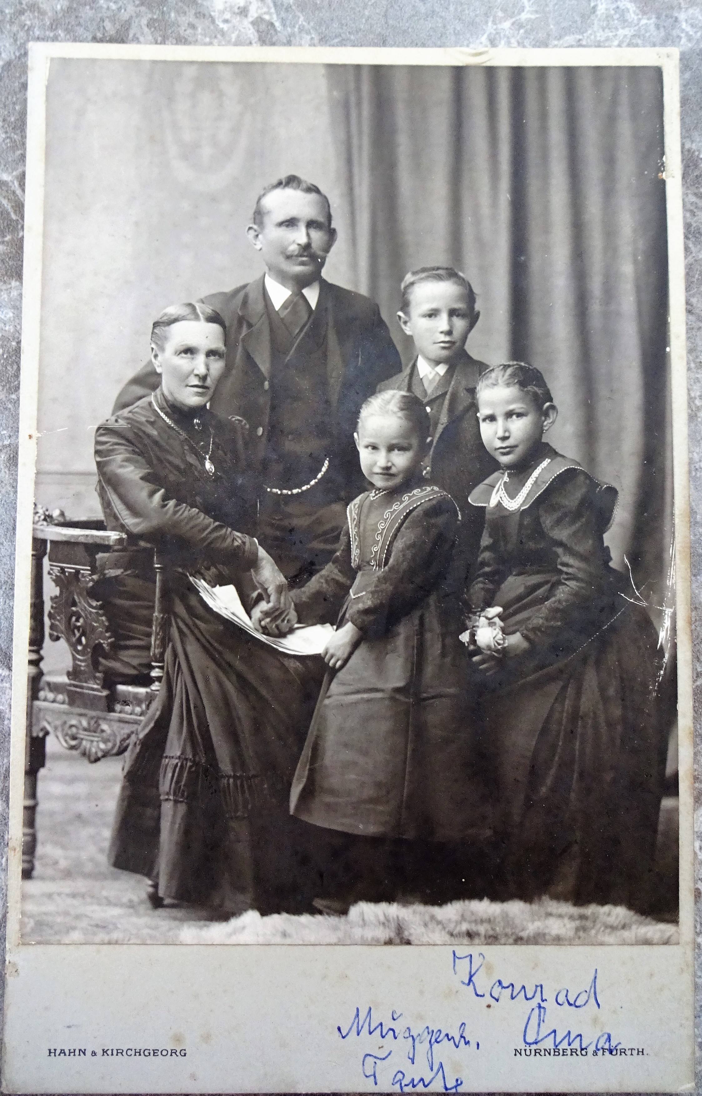 | Beschreibung | Foto der Familie Johann Lämmermann aus Stadeln vom Atelier Hahn & Kirchgeorg, ca. 1893 | ||