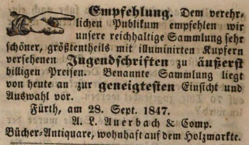 | Dateiinfo (Bild-Unterschrift und Info-Box, automatisch erstellt) | Zeitungsanzeige des Bücherantiquars A. L. Auerbach, September 1847 Lizenz: NoC-NC 1.0 | ||