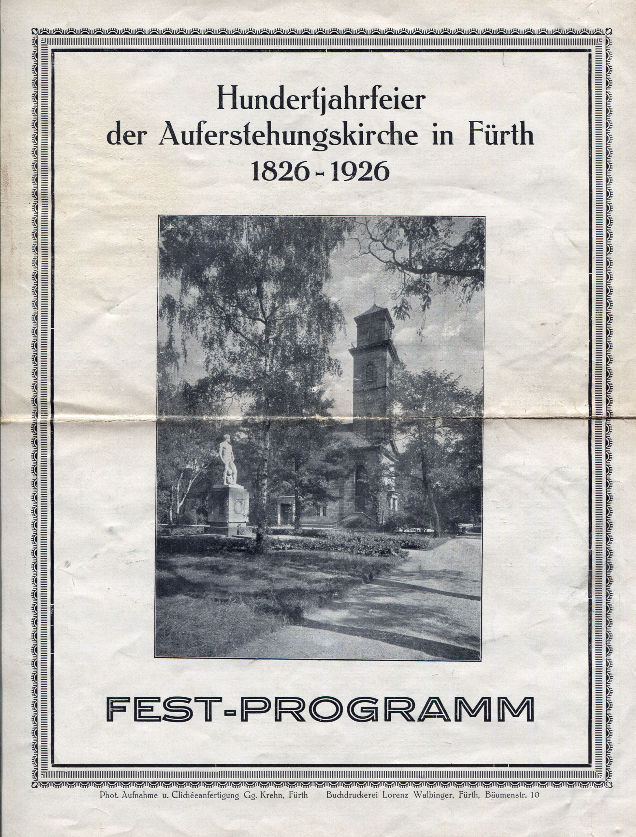 | Beschreibung | Hundertjahrfeier der Auferstehungskirche in Fürth 1826 - 1926 - Festprogramm, Seite 1 | ||