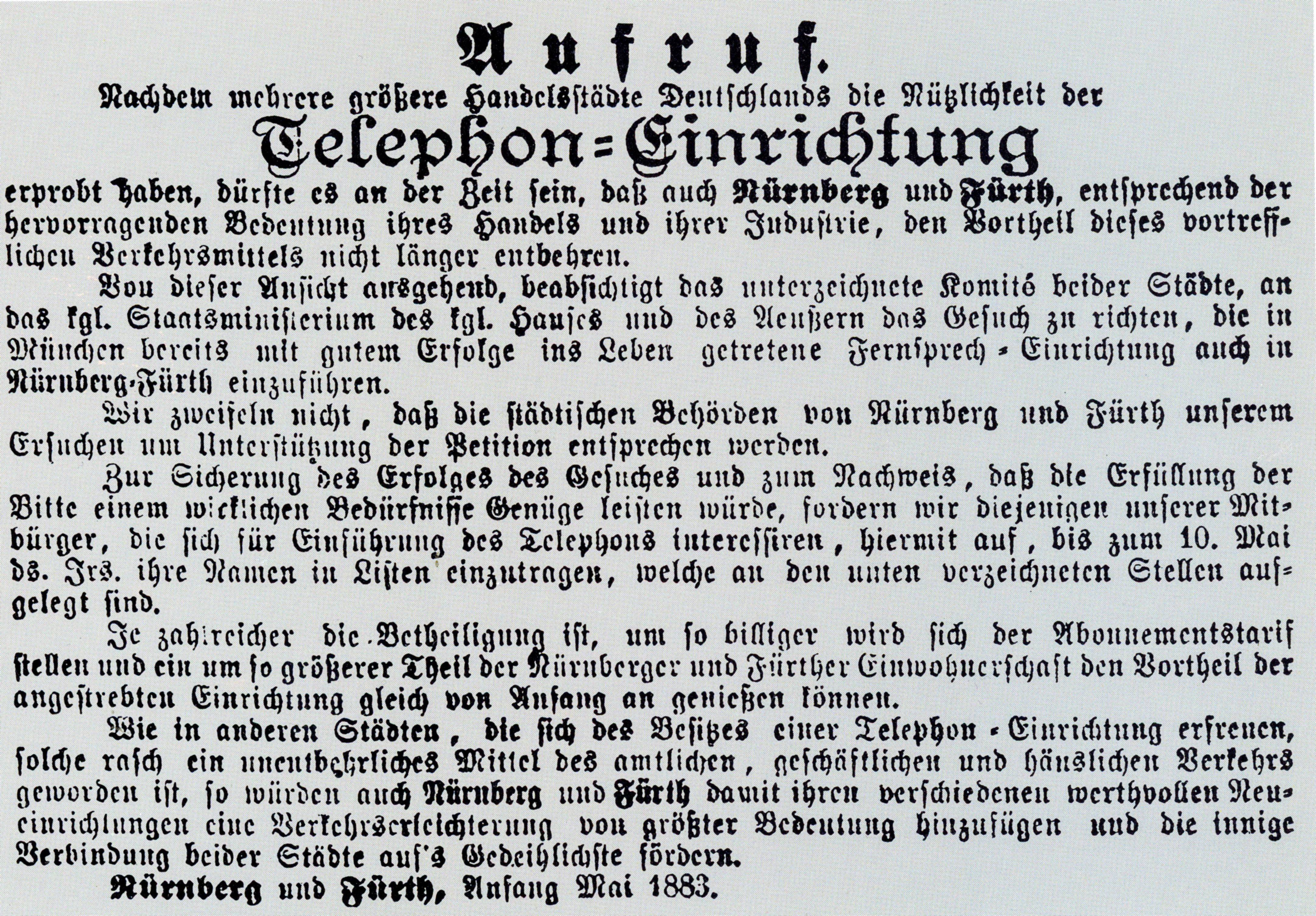 | Beschreibung | Aufruf Telephon-Einrichtung in Fürth-Nürnberg im Fränkischen Kurier, Mai 1883 | ||