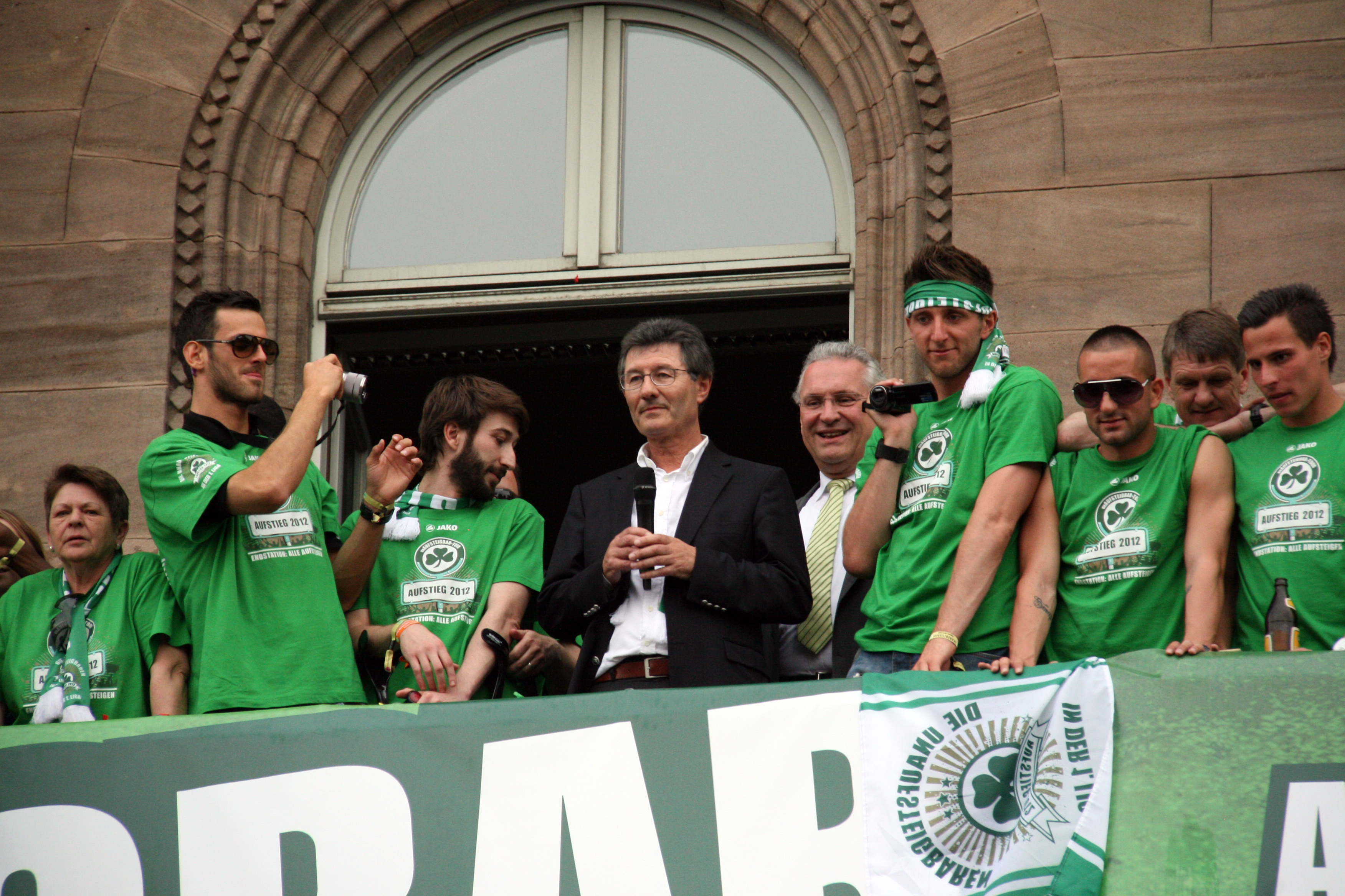 | Beschreibung | Aufstiegsfeier der Spielvereinigung am Rathaus mit Helmut Hack und Innenminister Joachim Herrmann, April 2012 | ||