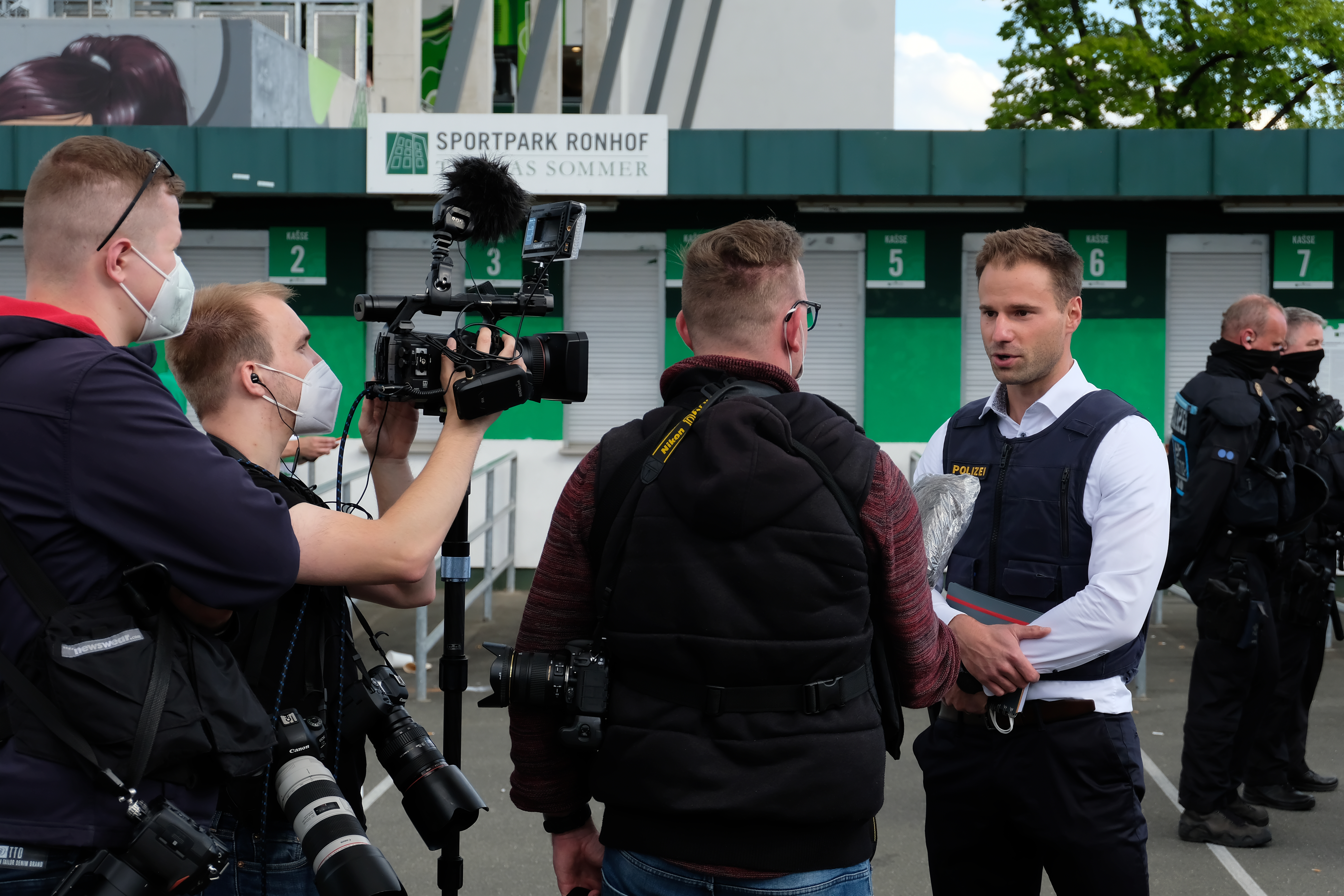 | Beschreibung | Pressesprecher der Polizei bei einem Interview für Medienvertreter zur Aufstiegsfeier 2021 der Spielvereinigung im Mai 2021 | ||