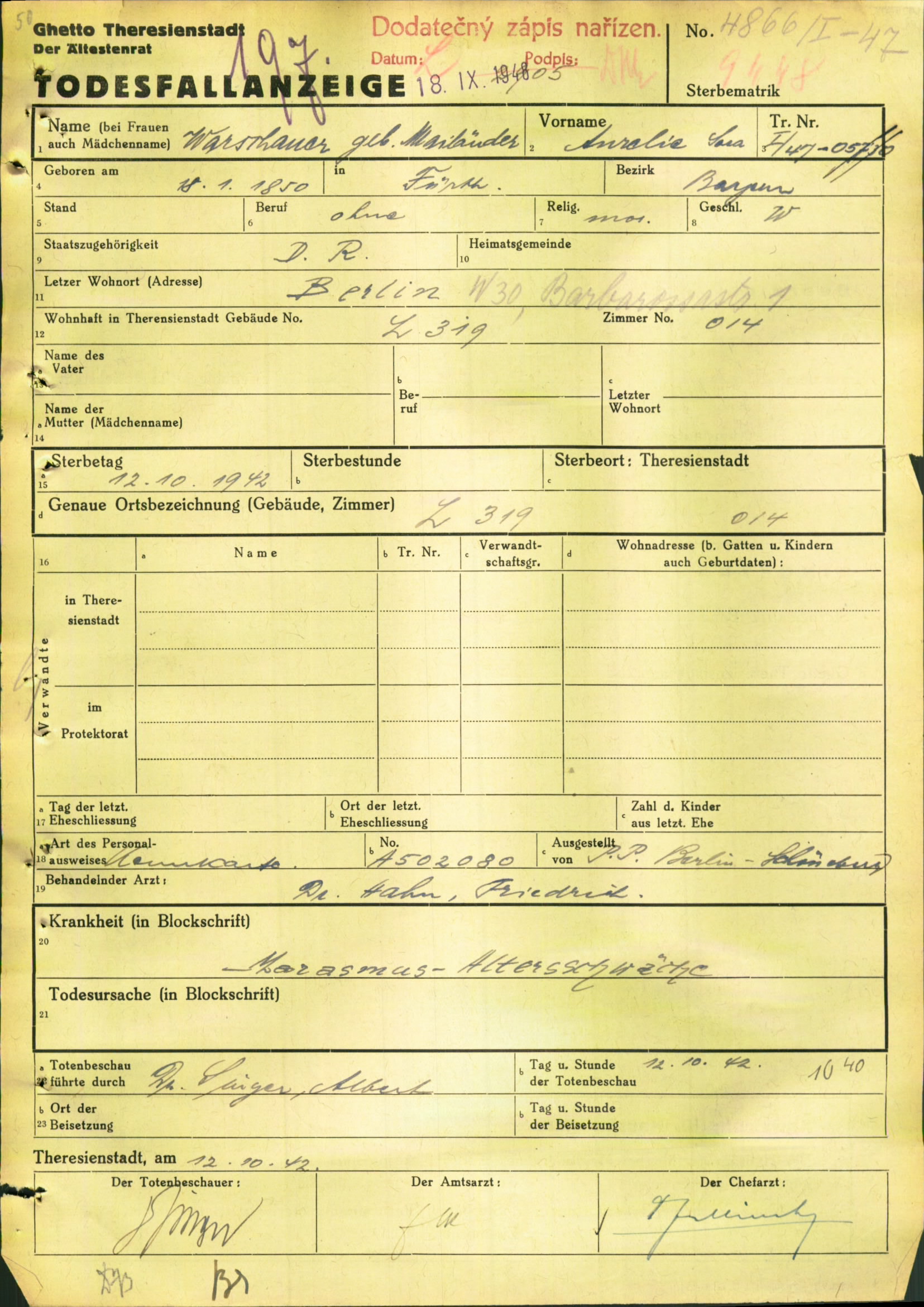 | Dateiinfo (Bild-Unterschrift und Info-Box, automatisch erstellt) | Todesurkunde Aurelie Warschauer, geb. Mailaender im KZ Theresienstadt Lizenz: CC BY-SA 3.0 | ||