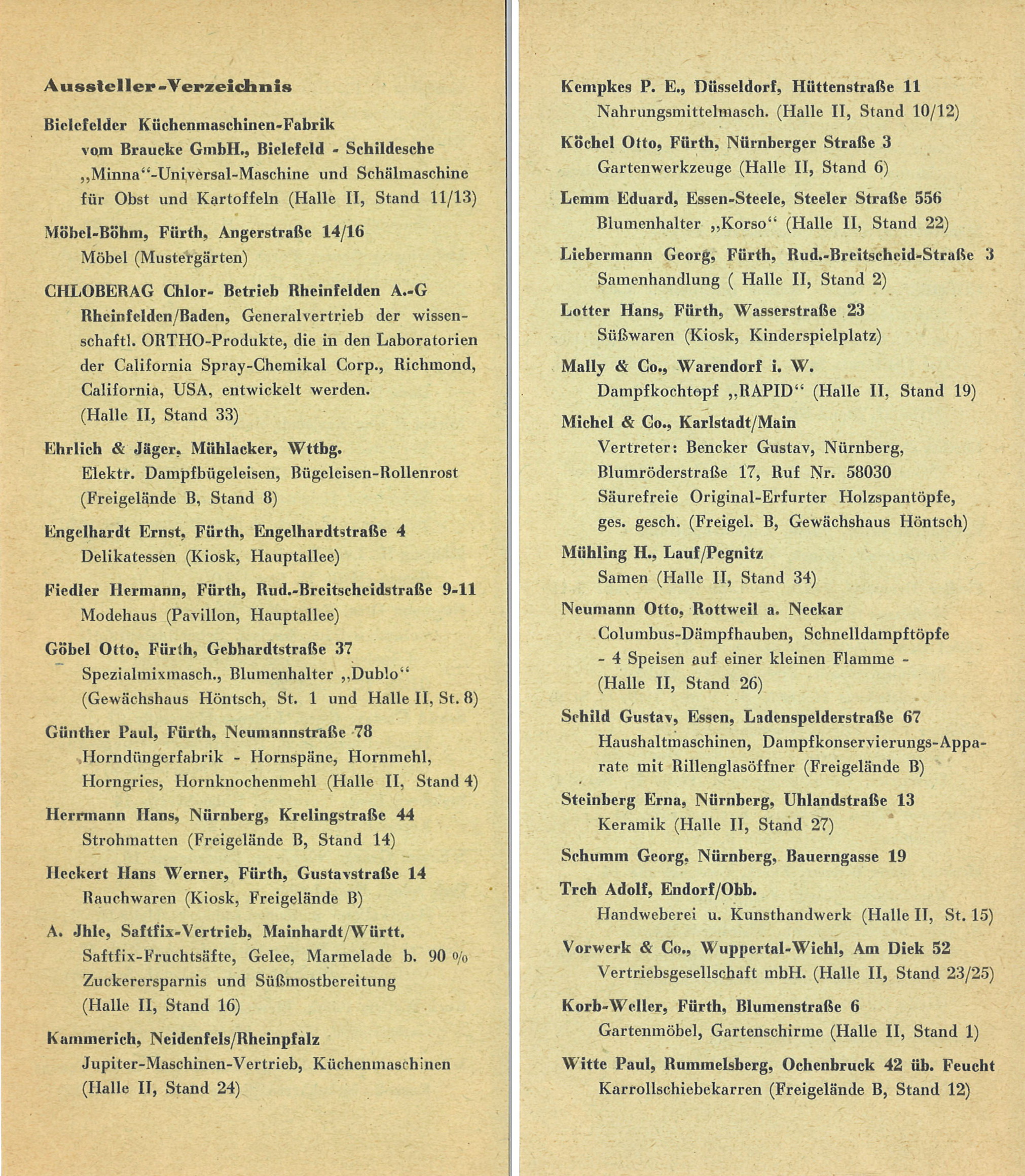 | Dateiinfo (Bild-Unterschrift und Info-Box, automatisch erstellt) | Aussteller-Verzeichnis zur Gartenschau Grünen und Blühen 1951 Urheber: Stadt Fürth<br><br><br>Lizenz: CC BY-SA 3.0 | ||